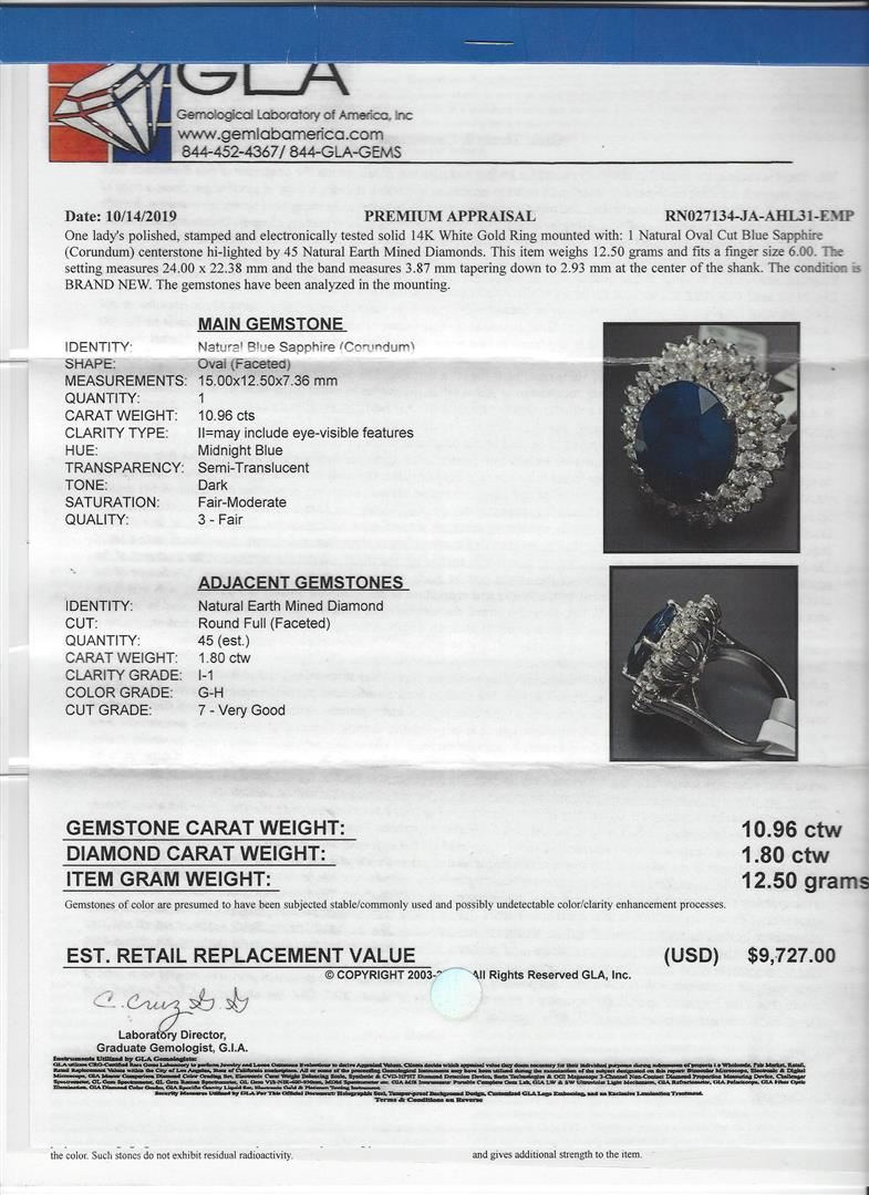 One 10.96ct Sapphire and Diamond Ring - 14KT White Gold . GLA certified. See Appraisal for more details. GLA Appraised.