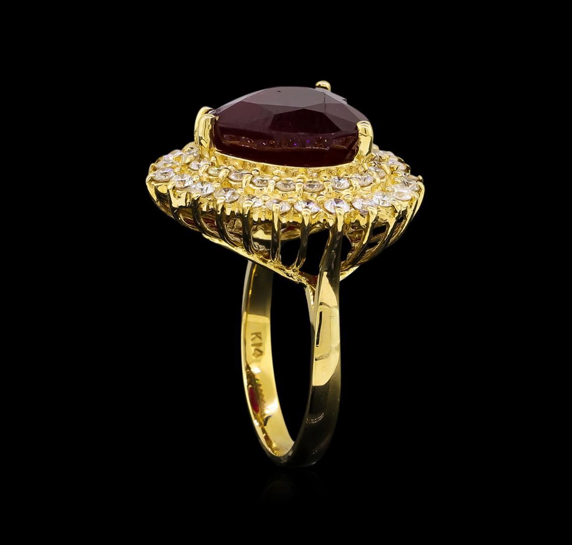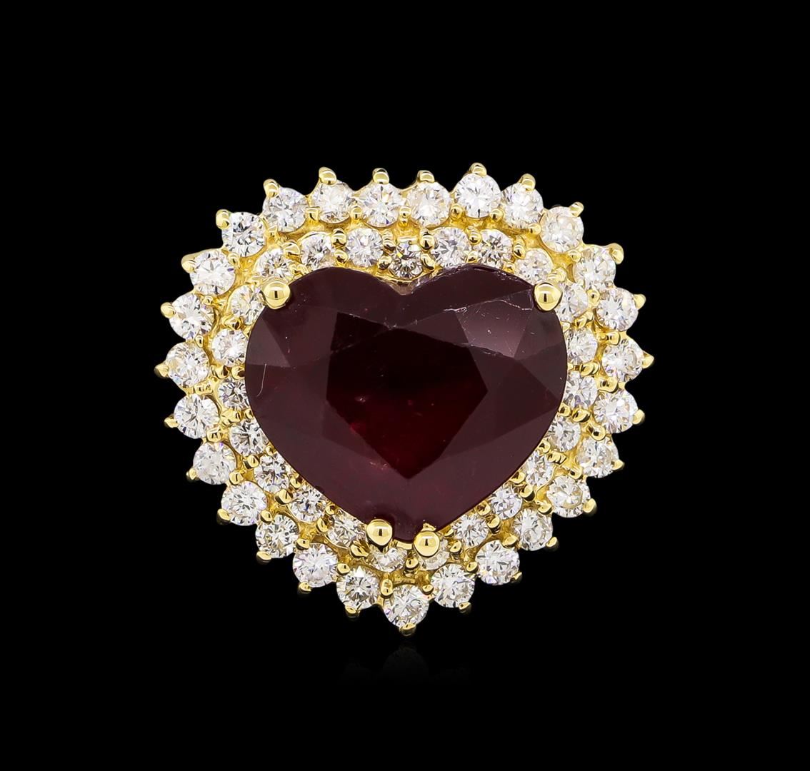 One electronically tested 14KT yellow gold lady's cast heart shape ring with a basket double halo with a bright polish finish. The featured lady's ring has a shank measuring 2.64 millimeters wide. Identified with markings of "14K". Condition is new, good workmanship. Containing: One prong set heart modified brilliant cut natural ruby, measuring 14.37 x 12.70 x 7.71mm, approximate weight of 10.98ct., clarity is heavily included, type II, dark, moderately strong, red color, (GIA R 7/4), cut is good. Naturally occurring internal & external characteristics are present. Indications of laboratory high temperature heat treatment, with glass & flux additives. Colored gemstones are presumed to have been subjected to commonly used enhancement processes. Graded in the setting. Fifty prong set round brilliant cut diamonds, measuring 2.00 - 1.90 x 1.23mm (depth est.) approximate total weight of 50 Stones = 1.42ct. Graded in the setting. Clarity: SI-1 to SI-2. Color: H - I. Cut Good. Total Weight of Colored Stones 10.98ct. Total Weight of Diamonds 1.42ct. Total Weight of Ring 9.70gm. GAS Appraised at $8,385.00.