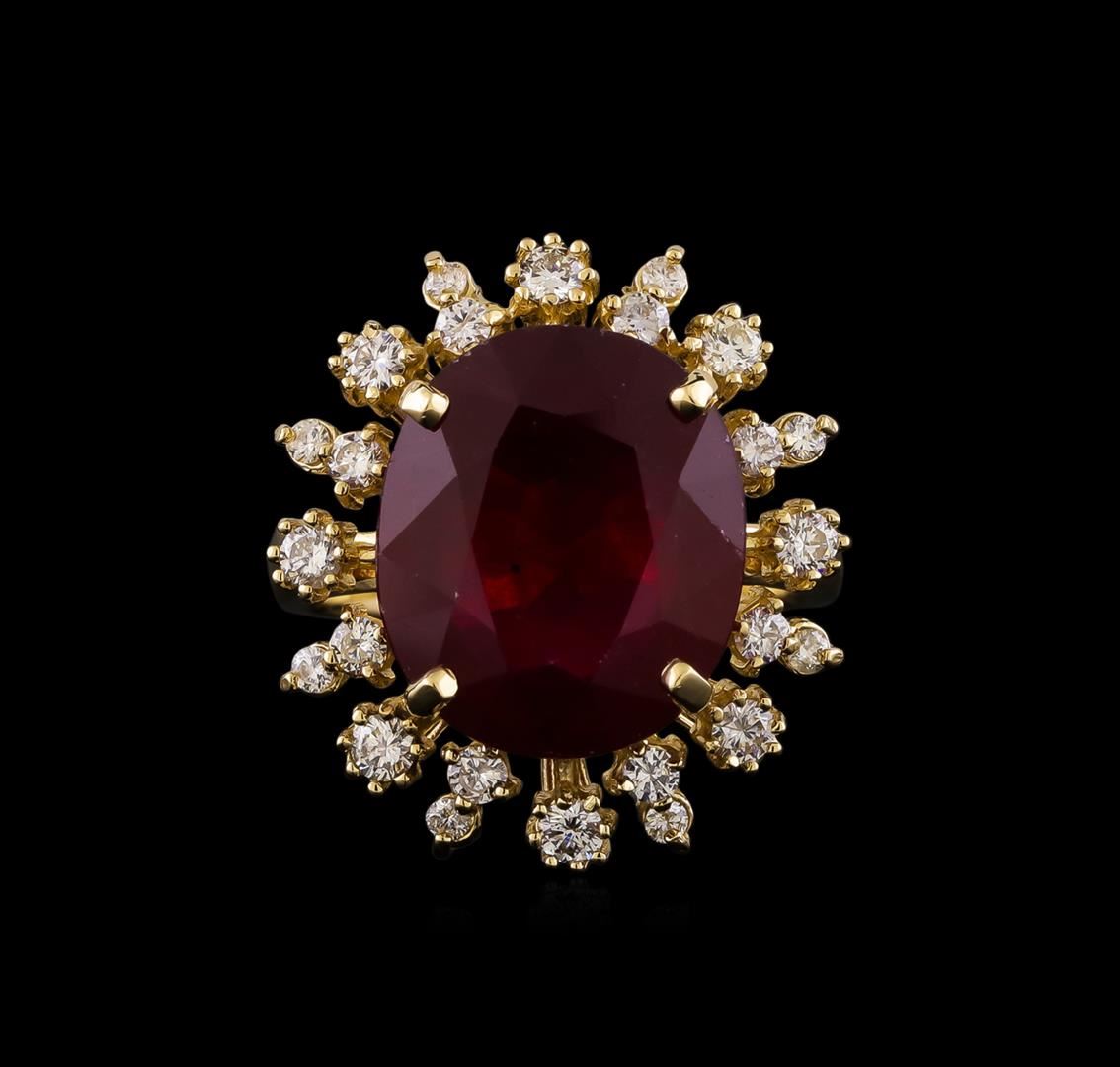 One electronically tested 14KT yellow gold lady's cast fashion ring with a basket double halo with a bright polish finish. The featured lady's ring has a shank measuring 2.99 millimeters wide. Identified with markings of "K14". Condition is new, good workmanship. Containing: One prong set oval modified brilliant cut natural ruby, measuring 14.70 x 12.54 x 6.22mm, (depth est.) 5%. bulge factor, approximate weight of 10.98ct., clarity is severely included, dark, moderately strong, slightly purplish red color, (GIA slpR 7/4), cut is very good. Colored gemstones are presumed to have been subjected to commonly used enhancement processes. Indications of laboratory high temperature heat treatment, with glass & flux additives. Graded in the setting. Eight prong set round brilliant cut diamonds, measuring 2.30 - 2.20 x 1.40mm (depth est.) approximate total weight of 8 Stones = 0.35ct. Graded in the setting. Clarity: VS-2 to SI-2. Color: H - I. Cut Good Eight prong set round brilliant cut diamonds, measuring 2.00 - 1.90 x 1.17mm (depth est.) approximate total weight of 8 Stones = 0.22ct. Graded in the setting. Clarity: SI-1 to SI-2. Color: H - I. Cut Good Eight prong set round brilliant cut diamonds, measuring 1.60 - 1.55 x 0.98mm (depth est.) approximate total weight of 8 Stones = 0.12ct. Graded in the setting. Clarity: SI-1 to SI-2. Color: H - I. Cut Good. Total Weight of Colored Stones 10.98ct. Total Weight of Diamonds 0.69ct. Total Weight of Ring 8.30gm. GAS Appraised.