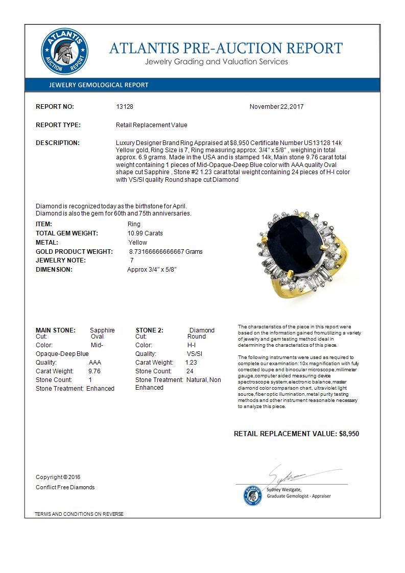 REF-125X5T -13128 ---- 10.99 CTW Blue Sapphire & Diamond Ring 14K Yellow Gold ---- Luxury Designer Brand Ring Appraised at $8,950 Certificate Number US13128 14k Yellow gold, Ring Size is 7, Ring measuring approx. 3/4" x 5/8" , weighing in total approx. 6.9 grams. Made in the USA and is stamped 14k, Main stone 9.76 carat total weight containing 1 pieces of Mid-Opaque-Deep Blue color with AAA quality Oval shape cut Sapphire , Stone #2 1.23 carat total weight containing 24 pieces of H-I color with VS/SI quality Round shape cut Diamond