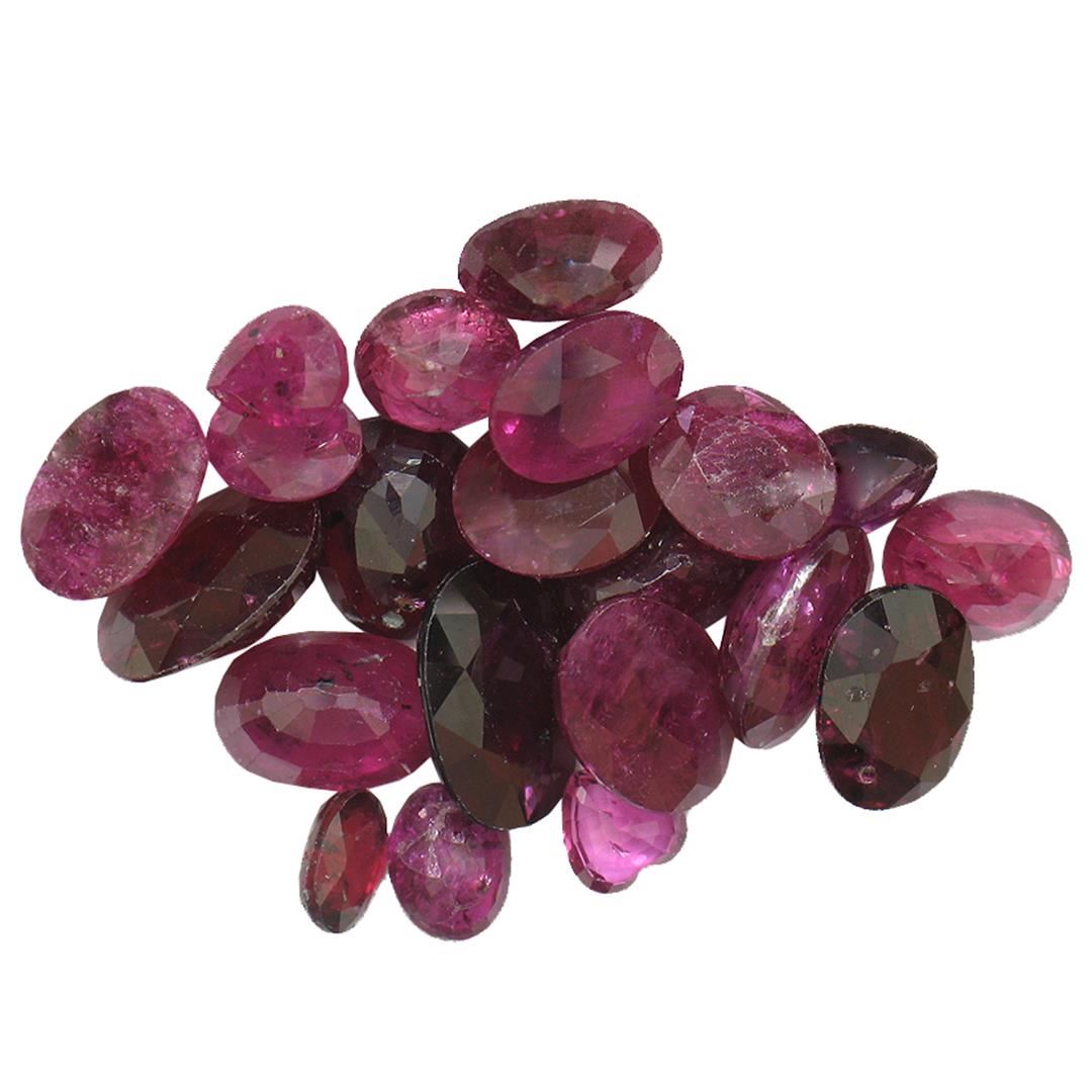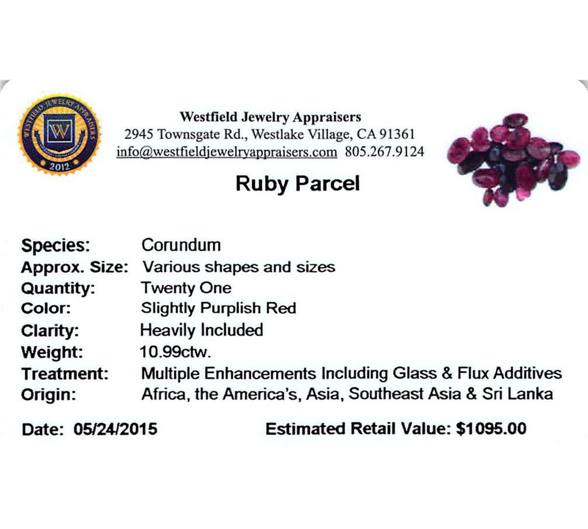 Twenty-one various shapes & sizes cut natural rubies exact total weight 10.99ct., clarity is heavily included, type II, dark, very slightly brownish, slightly purplish red color, (GIA slpR 7/3), cut is good. Transmitting light somewhat diffusely, transparent to translucent. Naturally occurring internal & external characteristics are present. Indications of laboratory high temperature heat treatment, with glass & flux additives. Ruby has a low tolerance to rhodium plating, repolishing the surface, & ultrasonic cleaning. Westfield Appraised at $1,095.00.