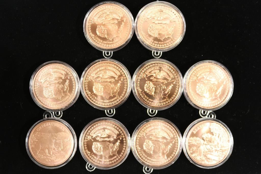 1 OUNCE EACH INCLUDES: ALLIGATOR, TIMBER WOLF, BISON, WHITETAIL DEER, GREAT HORNED OWL, MUSTANG, BALD EAGLE, BEAVER, GRIZZLY BEAR AND LARGEMOUTH BASS. DESIGNED BY THOMAS D. ROGERS, SR. ALL IN PLASTIC CAPSULES.