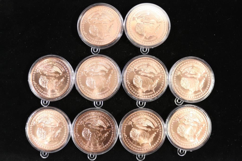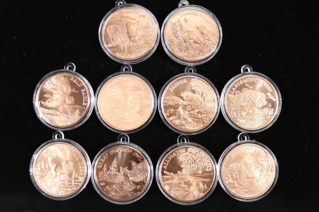 1 OUNCE EACH INCLUDES: ALLIGATOR, TIMBER WOLF, BISON, WHITETAIL DEER, GREAT HORNED OWL, MUSTANG, BALD EAGLE, BEAVER, GRIZZLY BEAR AND LARGEMOUTH BASS. DESIGNED BY THOMAS D. ROGERS, SR. ALL IN PLASTIC CAPSULES.