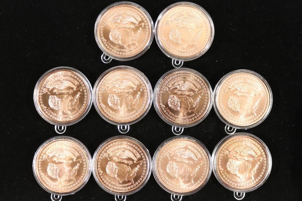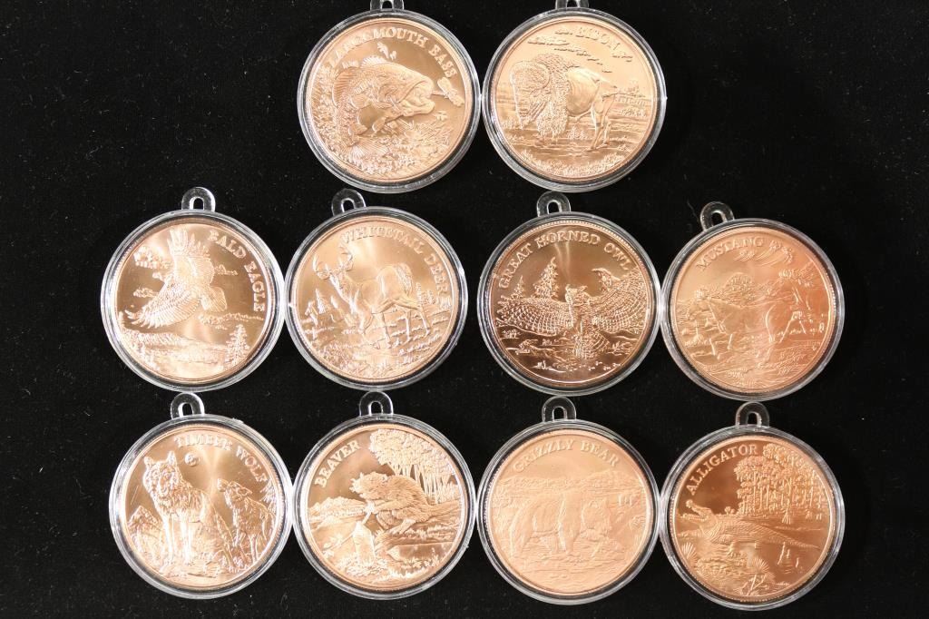 1 OUNCE EACH INCLUDES: ALLIGATOR, TIMBER WOLF, BISON, WHITETAIL DEER, GREAT HORNED OWL, MUSTANG, BALD EAGLE, BEAVER, GRIZZLY BEAR AND LARGEMOUTH BASS. DESIGNED BY THOMAS D. ROGERS, SR. ALL IN PLASTIC CAPSULES.