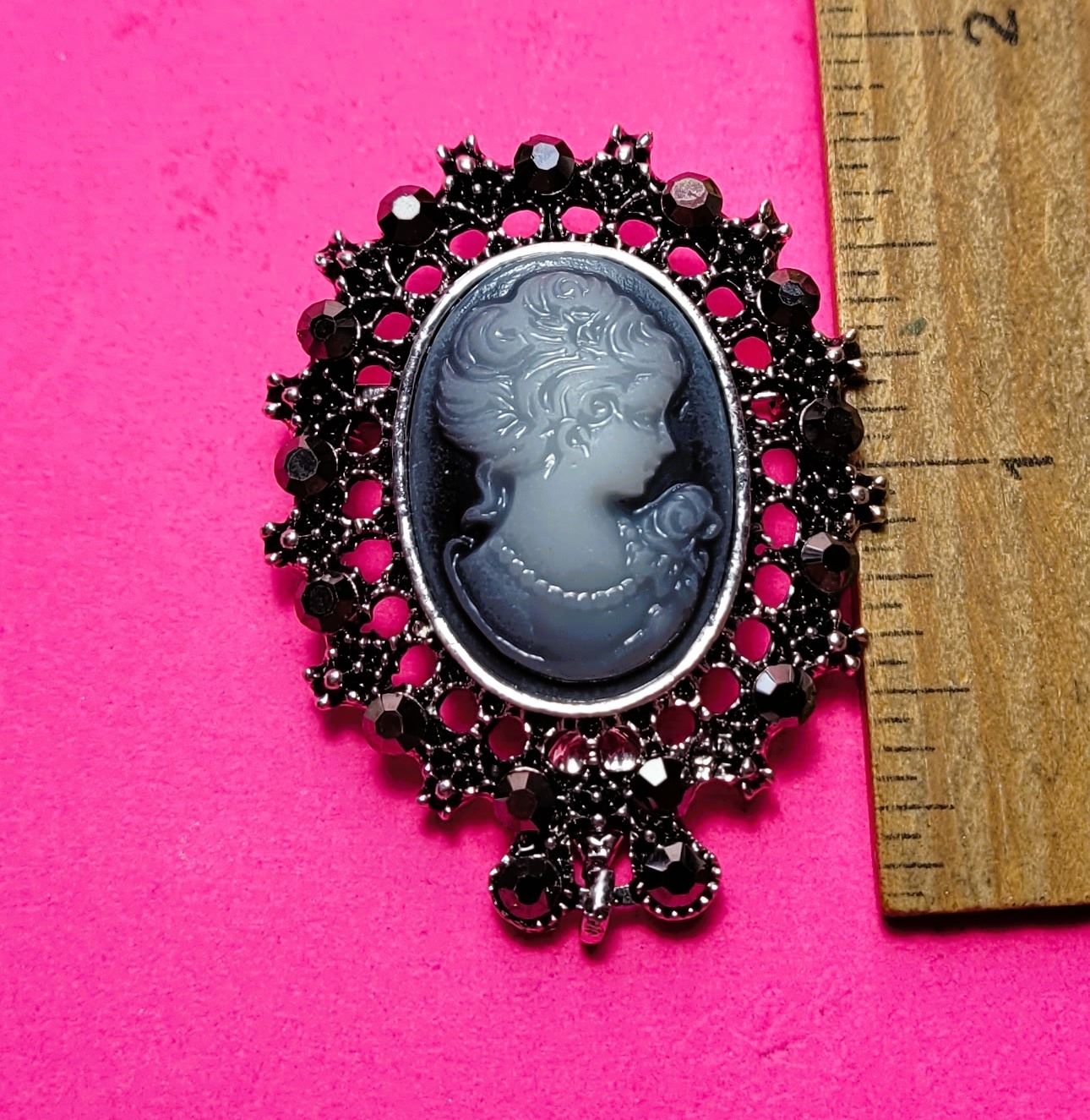 BROOCH WITH ORNATE FILAGREE AND CHARCOAL GREY CRYSTALS SETTING. JEWELLERY