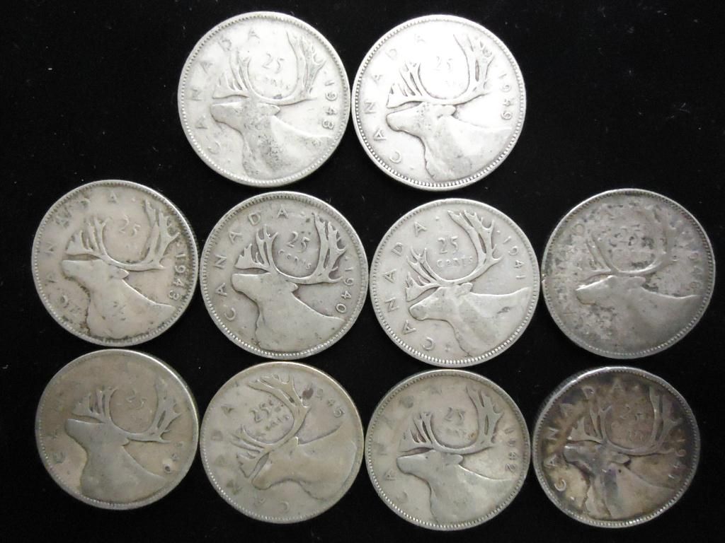 10 ASSORTED 1940'S CANADA SILVER 25 CENTS