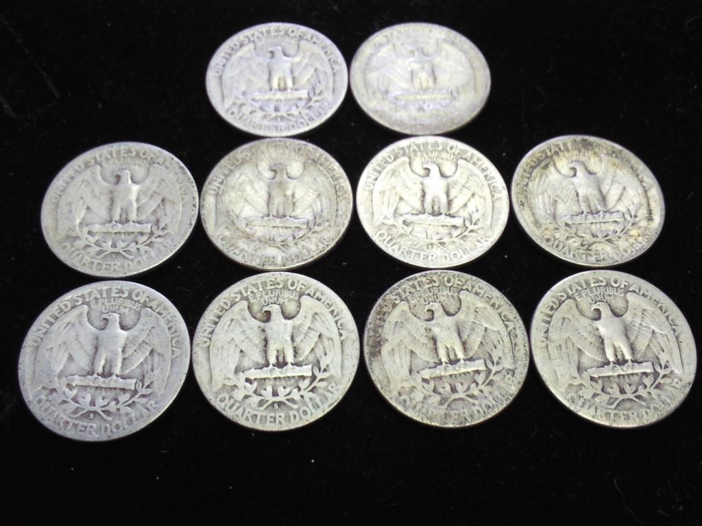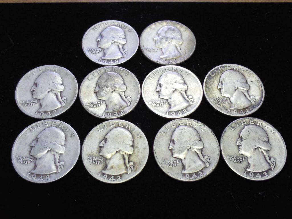10 ASSORTED 1940'S WASHINGTON SILVER QUARTERS