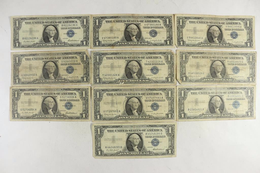10 ASSORTED 1957 $1 SILVER CERTIFICATES