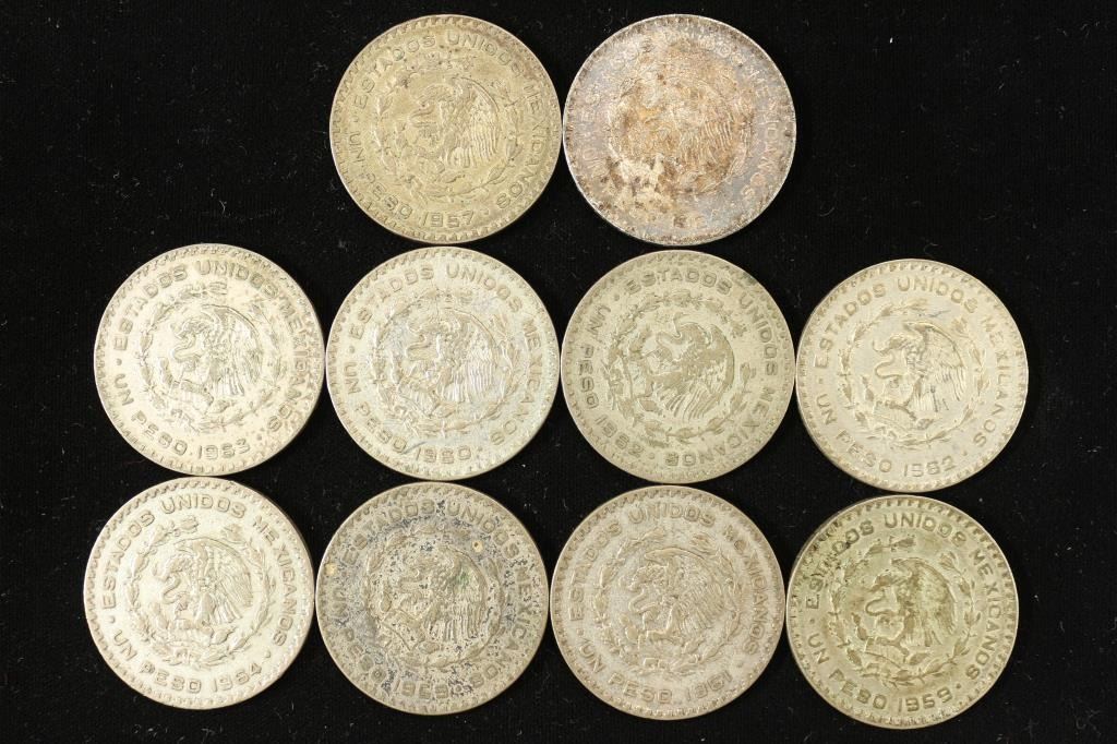10 ASSORTED 1957-1964 MEXICO .100 SILVER PESOS