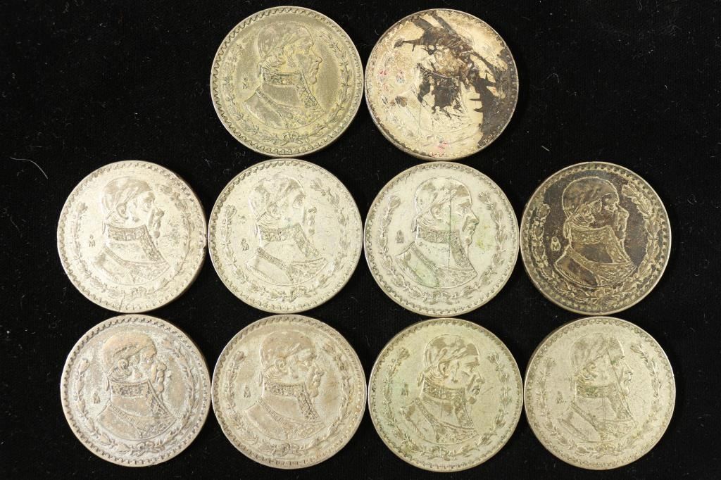 10 ASSORTED 1958-1967 MEXICO .100 SILVER PESOS