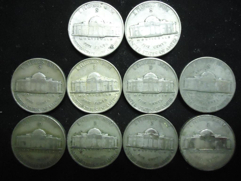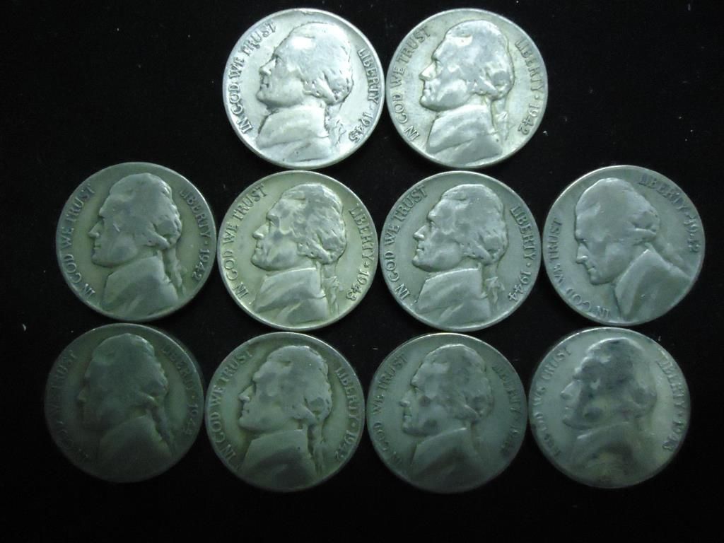 10 ASSORTED 35% SILVER JEFFERSON WAR NICKELS