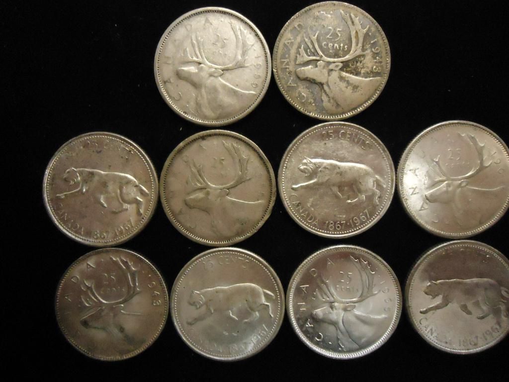 10 ASSORTED CANADA SILVER 25 CENTS