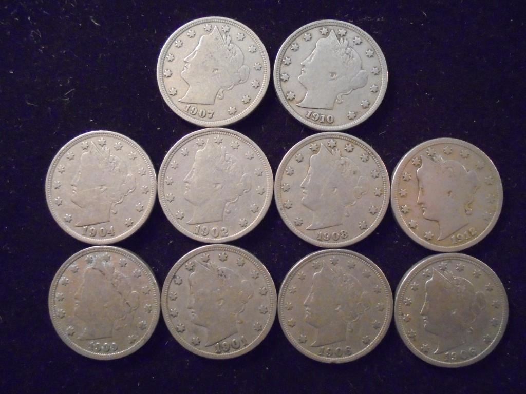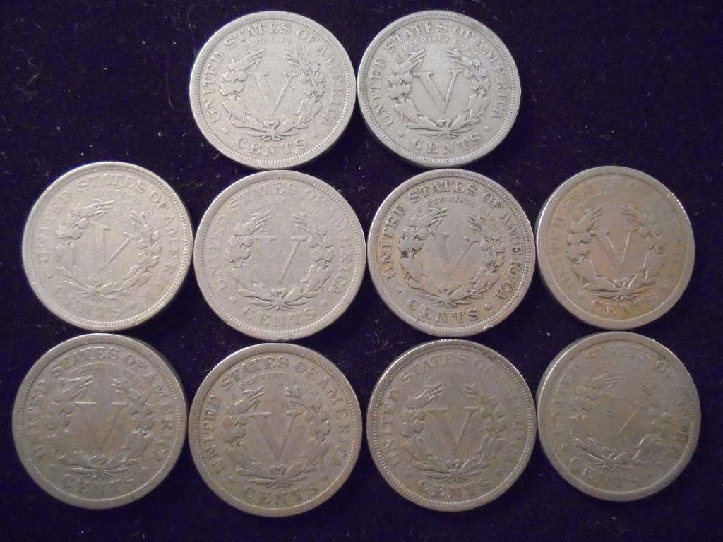 10 ASSORTED LIBERTY "V" NICKELS ALL VG'S +