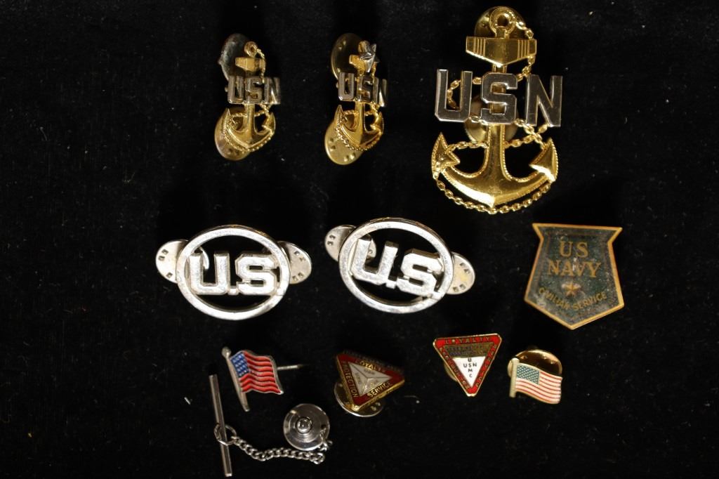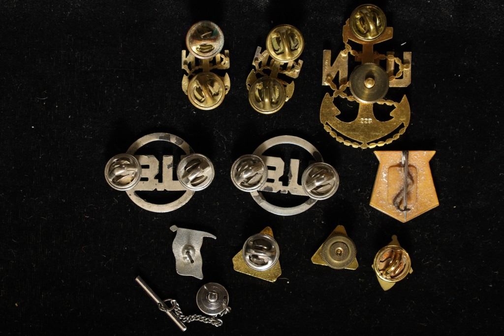 STERLING (THE 3 WITH USN WITH A SHIPS ANCHOR) TOP 3 IN THE PICTURE. SOME COLORIZED. MOSTLY U.S. NAVY, ONE IS PLASTIC. NEAT COLLECTORS BATCH