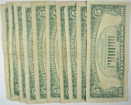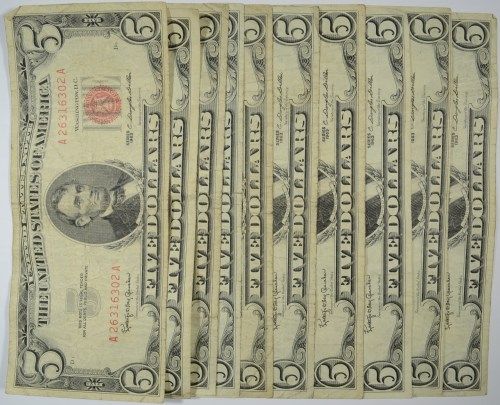 ( 10 ) AVERAGE CIRCULATED U.S. $5.00 RED SEAL NOTES, ALL ARE COMPLETE