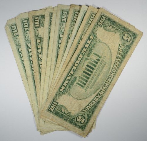 ( 10 ) AVERAGE CIRCULATED U.S. $5.00 RED SEAL NOTES, ALL ARE COMPLETE