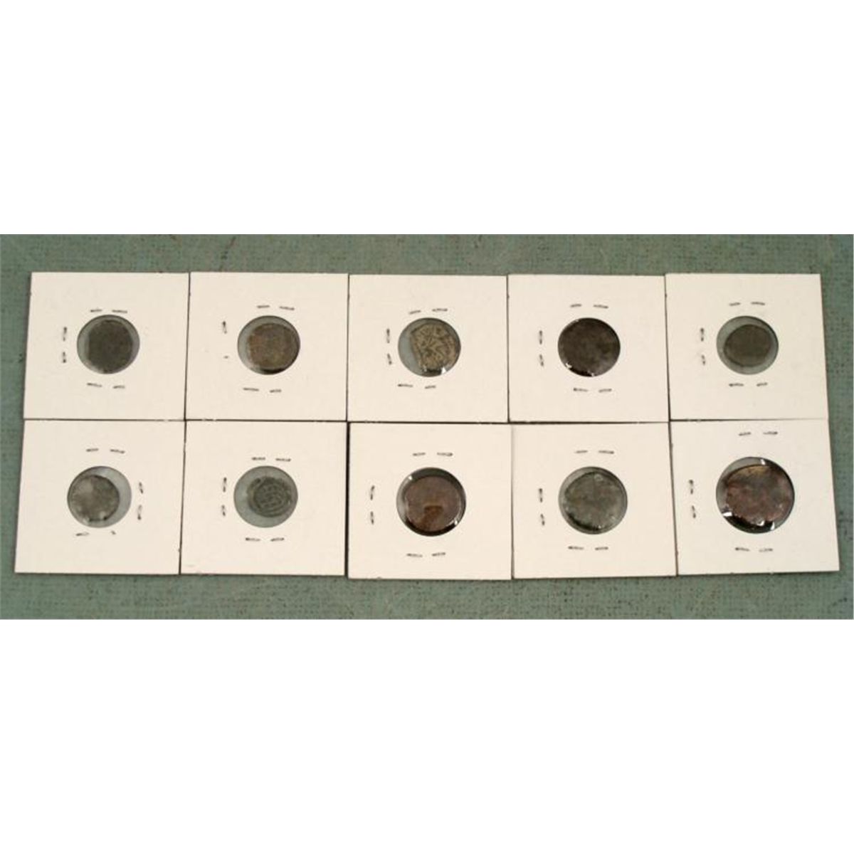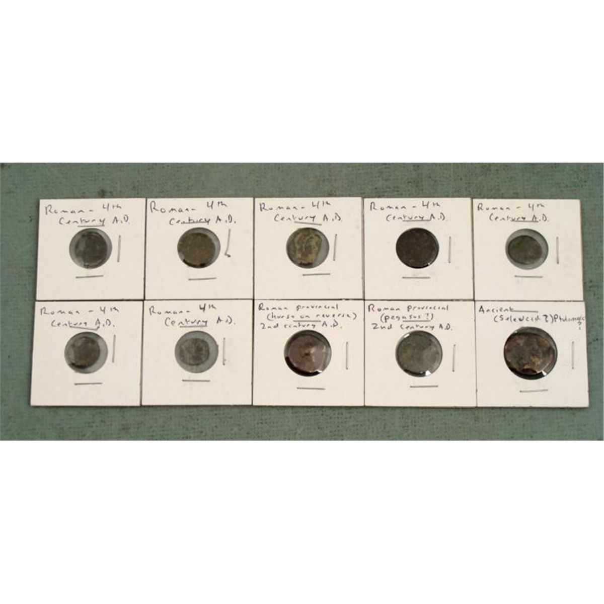 Lot of 10 ancient Imperial Roman coins * (7) 4th Century(1) 2nd Century Provincial with horse on reverse(1) 2nd Century Provincial with Pegasus(?) on reverseAncient Ptolemaic(?) * Size: 5/8" to 3/4" in diameter *