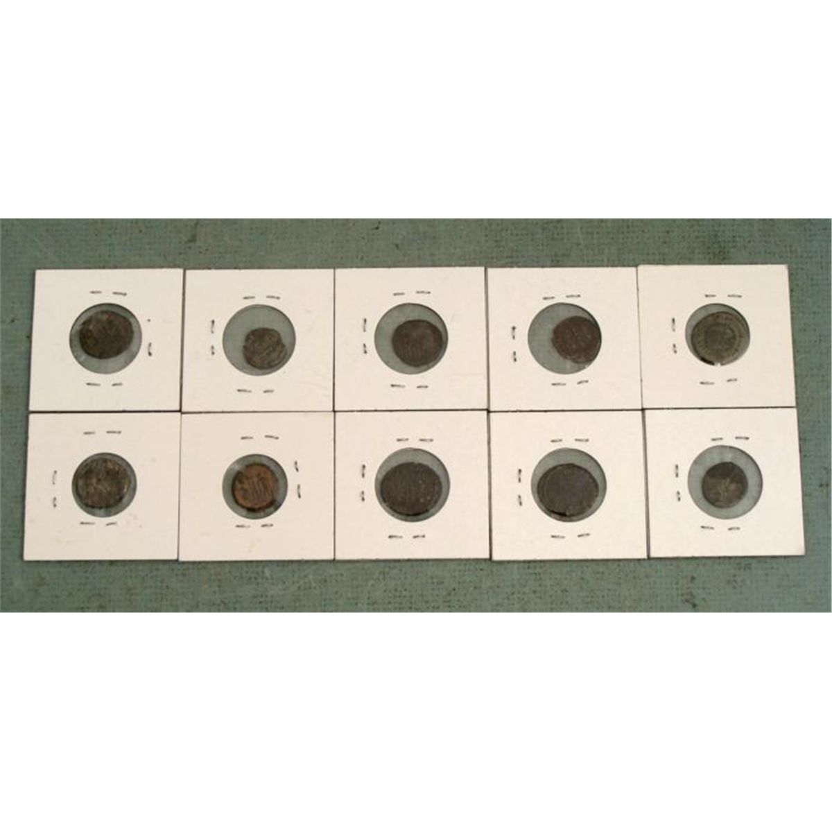 Lot of 10 ancient Imperial Roman coins * (5) Constantine I (307-337 A.D.)(2) Constantine II (337-361 A.D.)(3) Constantius II (337-361 A.D.) * Size: 5/8" to 3/4" in diameter *