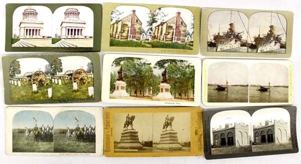 10 Antique Stereoscope Cards, features Civil War Monuments, Grant's Birthplace, Harper's Ferry, and Spanish American War cards including Rough Riders and the Sinking of the Maine