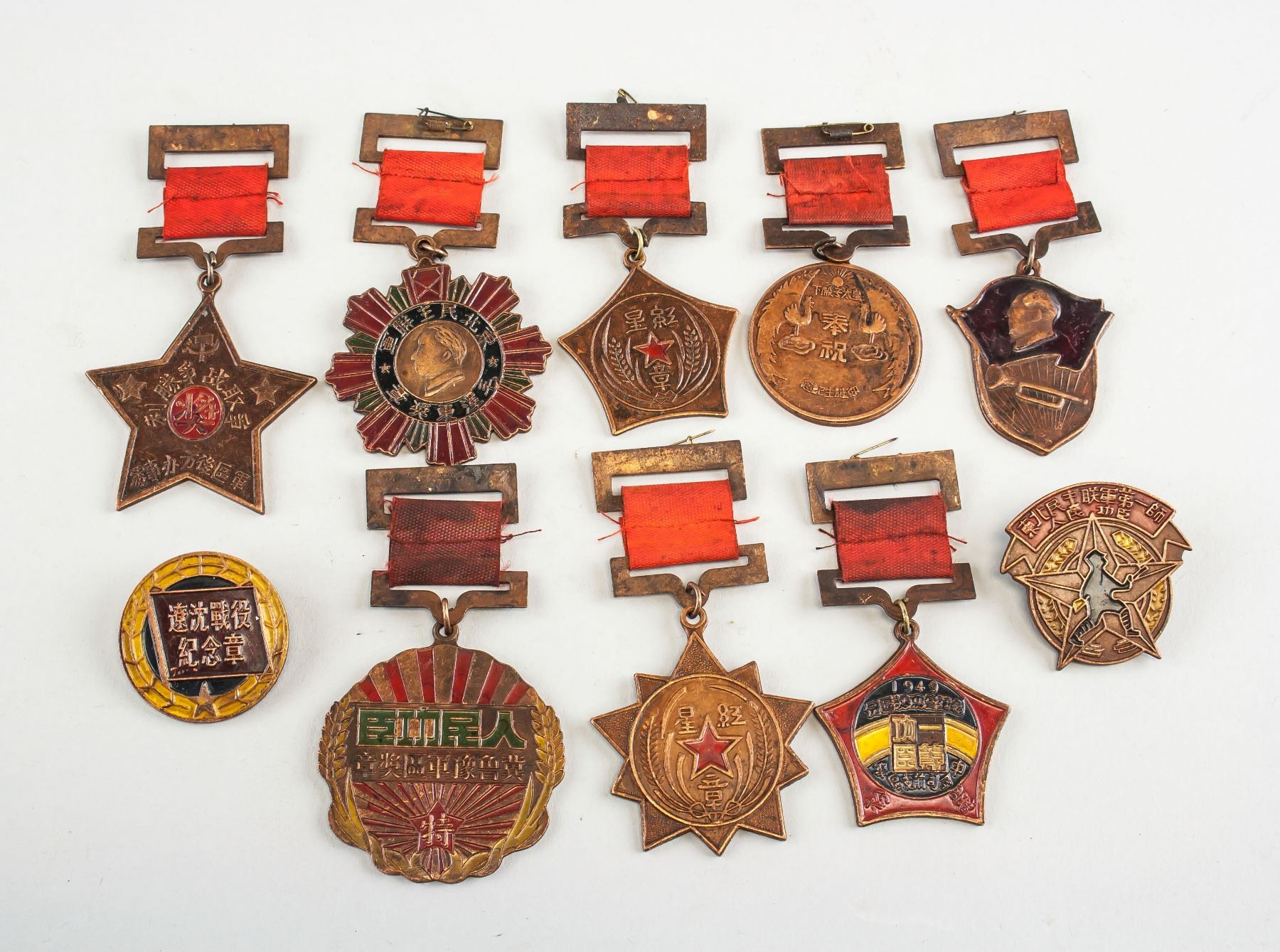 10 assorted Chinese medals, H: 3.5-5.5 cm, W: 3.5-5 cm, 193 grams total