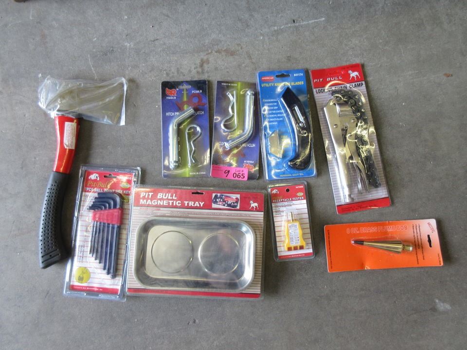 Shingle Hammer, Utility Knife, Receptacle Tester, Plumb Bob, 2 Hitch Pins, Locking Chain Clamp, Hex Key Set, Magnet Tray & Axe