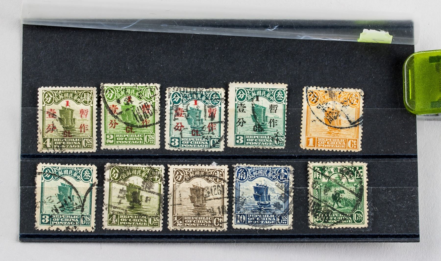 Ten (10) assorted Republic of China postage stamps, one half cent, one 1 cent, one 2 cent, three 3 cents, two 4 cents, one 10 cents, one 50 cents