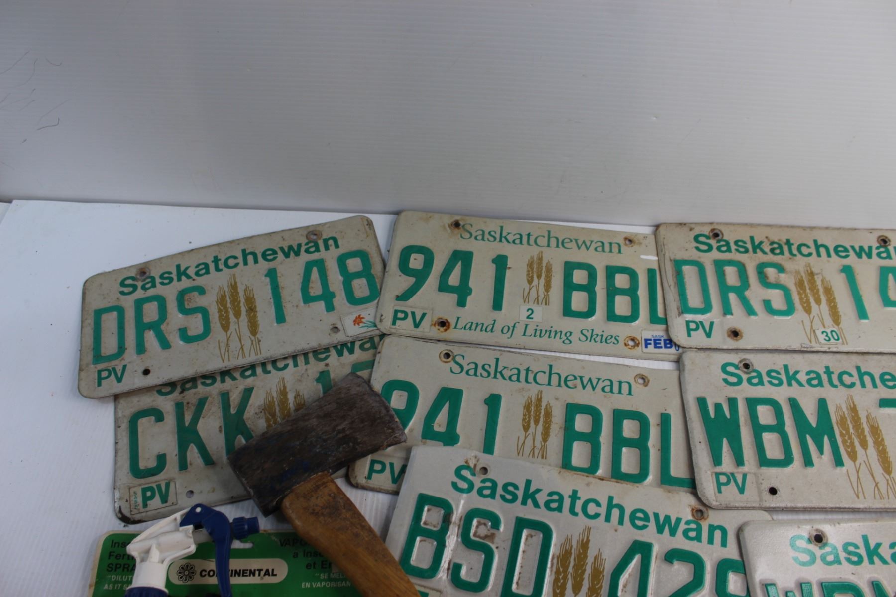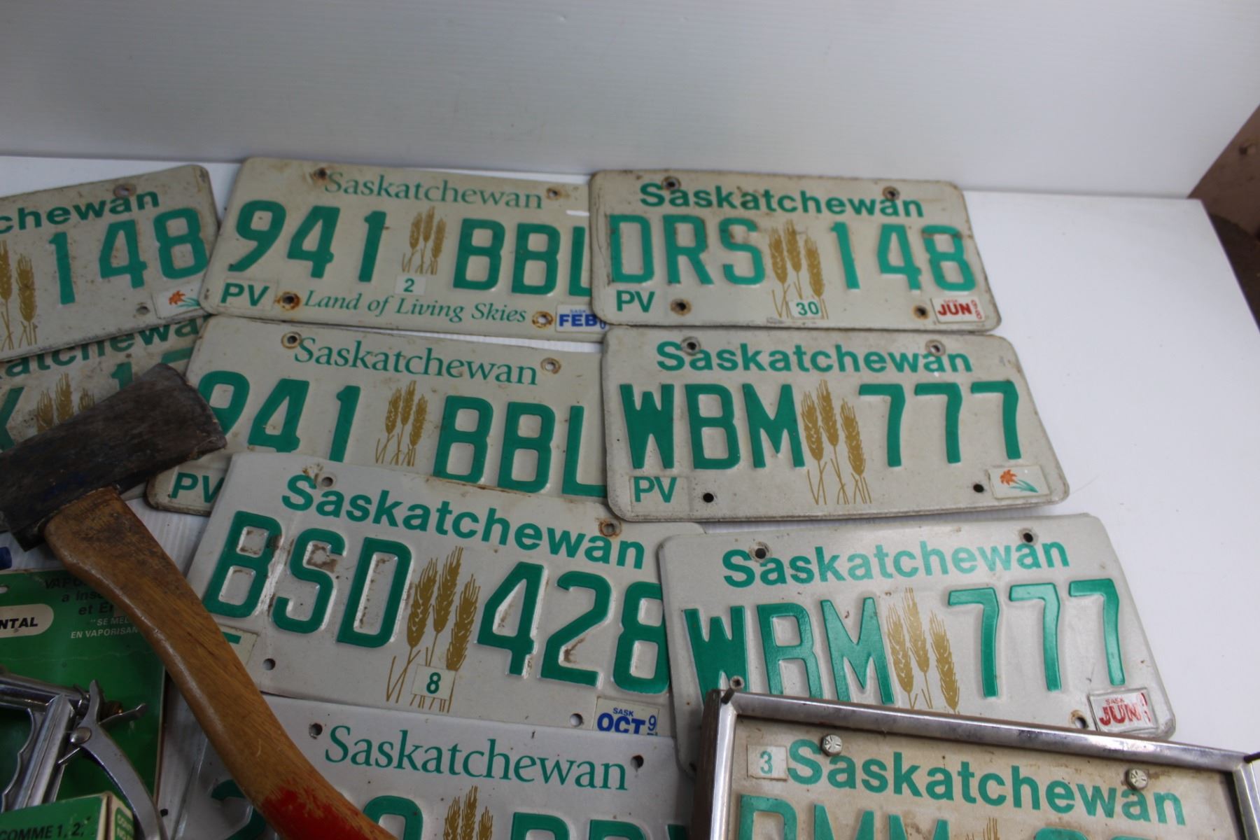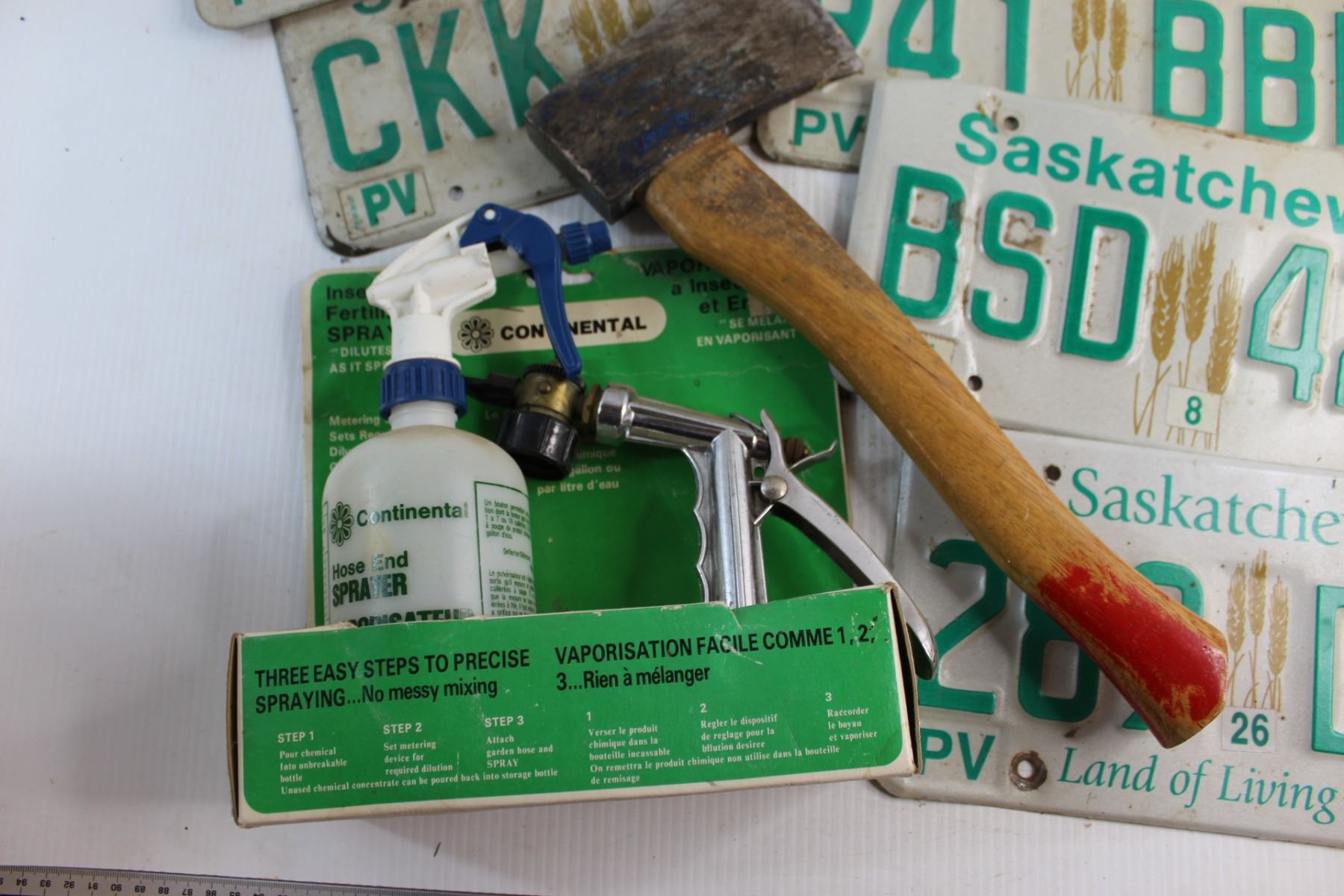 (10) Assorted Saskatchewan Licence Plates, Axe and Fertilizer Sprayer