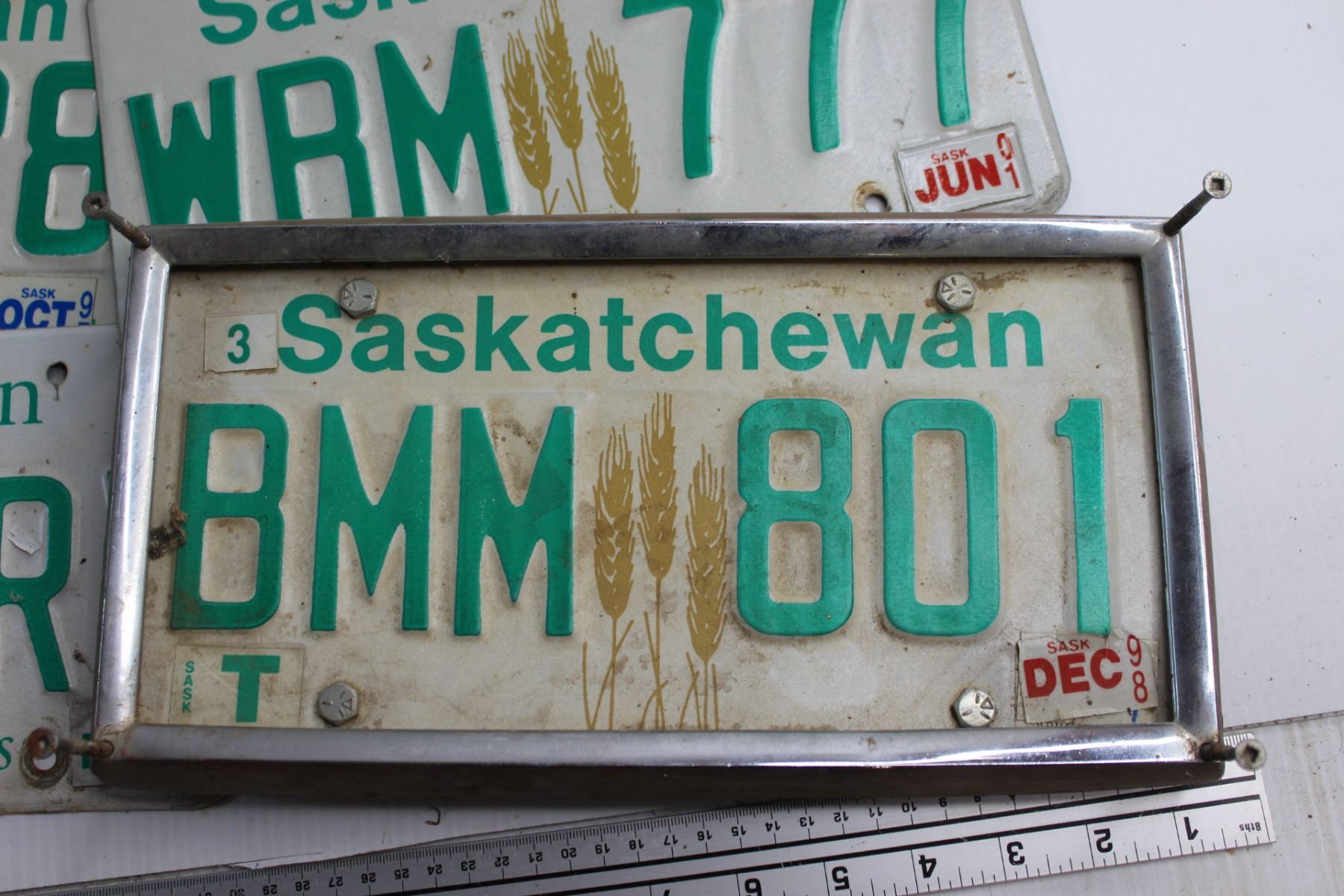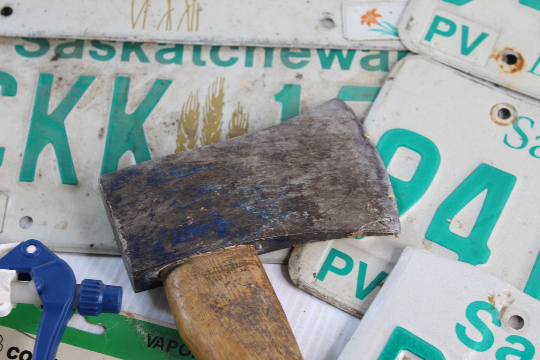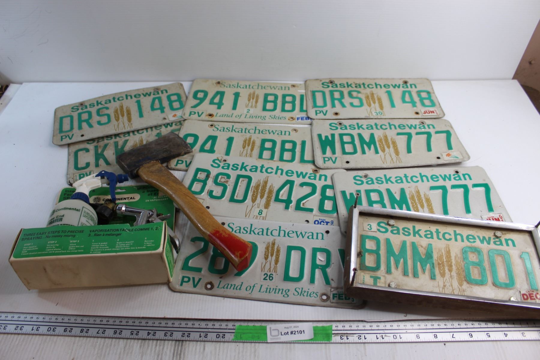 (10) Assorted Saskatchewan Licence Plates, Axe and Fertilizer Sprayer