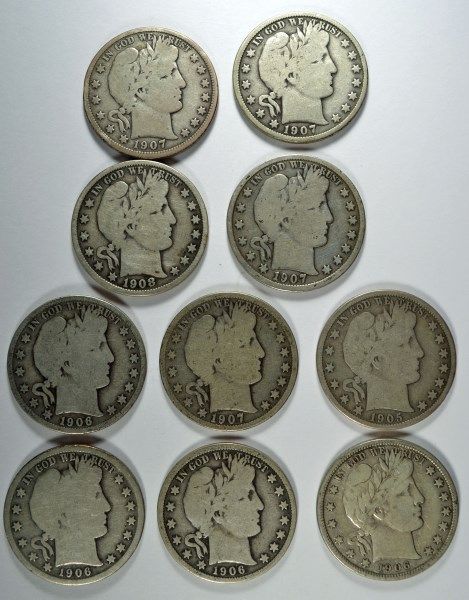 10 BARBER HALF DOLLARS (05-S,06,06-D,06-O,06-S,07,07-D,07-O,07-S,08) AG-FINE