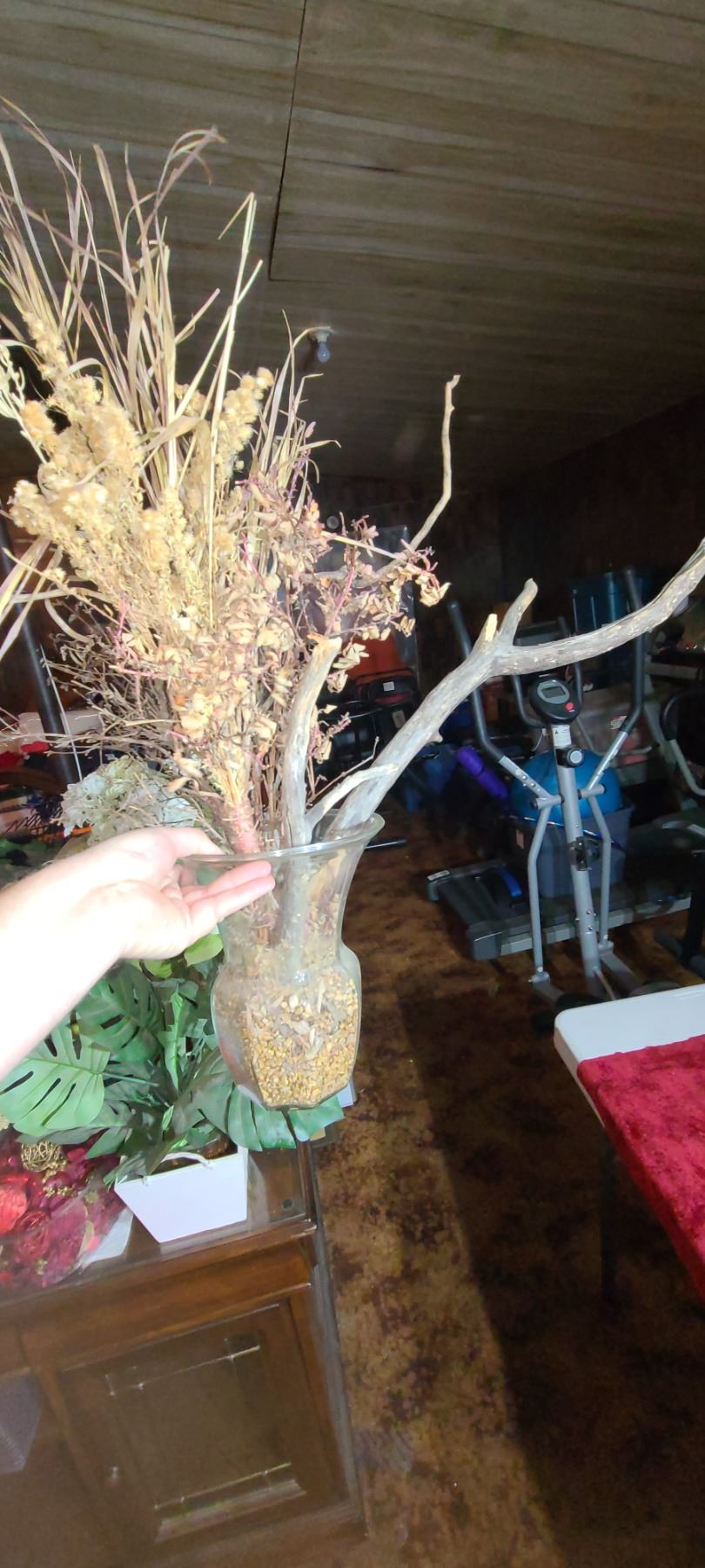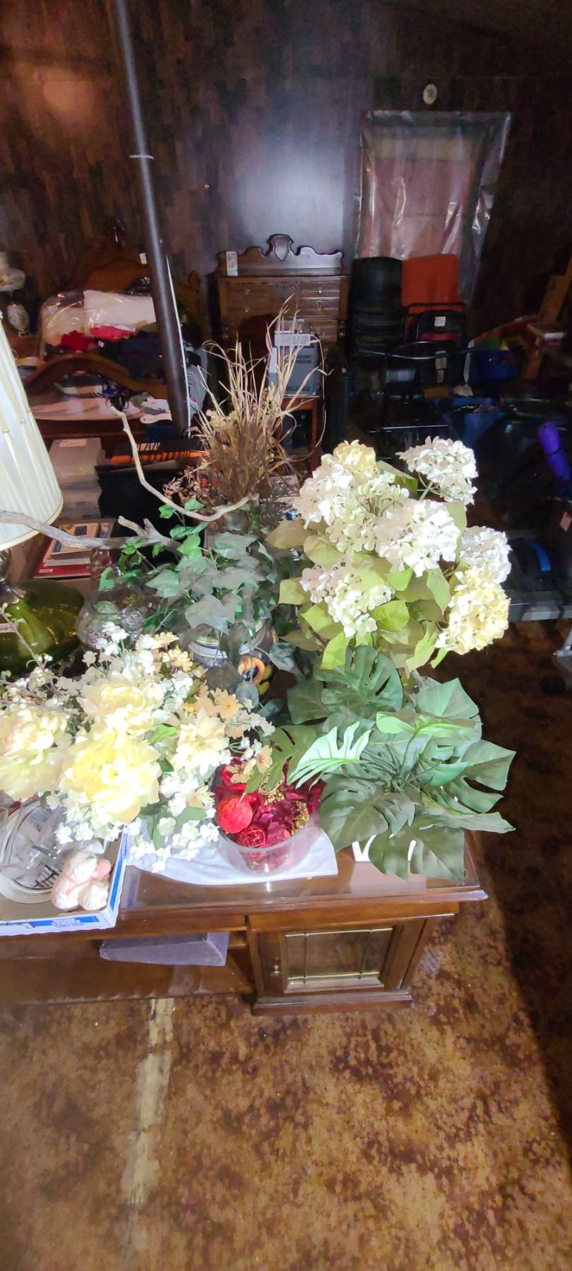 10 BIG ASSORTED LARGE VASES AND FLOWERS ON TOP OF DESK