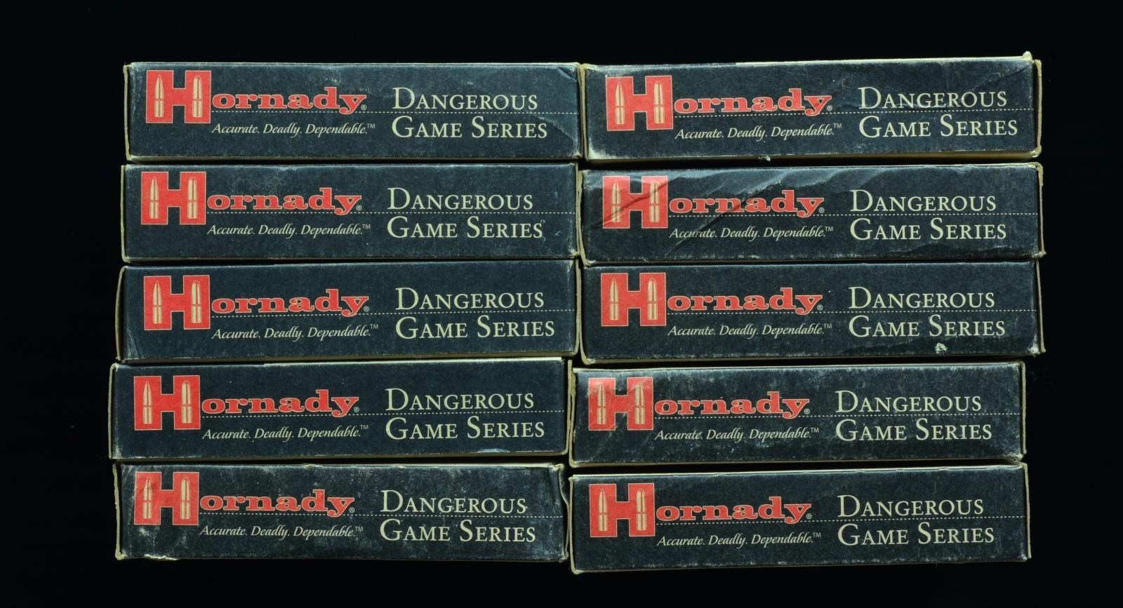 AMMO. 4 20 rd. Boxes of 500 Nitro Express 570 gr. DGS. / 6 - 20 rd. Boxes of 450 Rigby 480 gr. DGS. / 1 Partial box 18 of Barnes 500 Jeff. 510 dia. 535 gr. banded solid handloader's bullets. CONDITION: ammo & boxes appear to be in very good serviceable condition. (02-14675-2/MD). $600-900.
