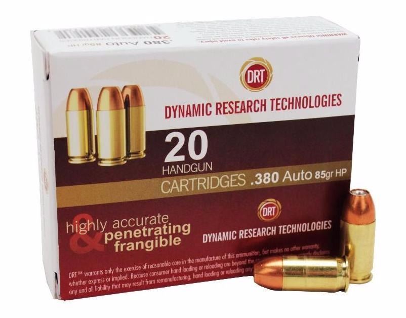 (250 ROUNDS) Mfr Items:Dynamic Research Tech Category:CENTERFIRE HANDGUN ROUNDS Mfr Scan:DRT Model:Terminal Shock Series:Lead Free Pistol Caliber:380 Automatic Colt Pistol (ACP) Bullet Type:Jacketed Hollow Point Bullet Weight:85 GR Muzzle Energy:209 ft lbs Muzzle Velocity:1050 fps Rounds Per Box:20 Application:Performance/Protection Casing Material:Brass Rating:+P BECCA