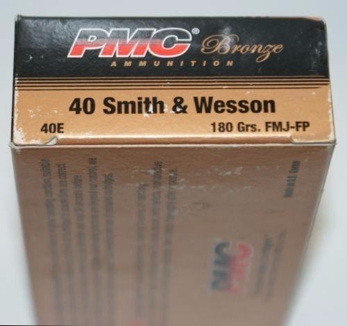 (500 ROUNDS) Mfr Items:PMC Category:CENTERFIRE HANDGUN ROUNDS Mfr Scan:PMC Model:Bronze Series:Handgun Caliber:40 Smith & Wesson Bullet Type:Full Metal Jacket Flat Point Bullet Weight:180 GR Muzzle Energy:388 ft lbs Muzzle Velocity:985 fps Rounds Per Box:50 Application:Performance/Protection BECCA
