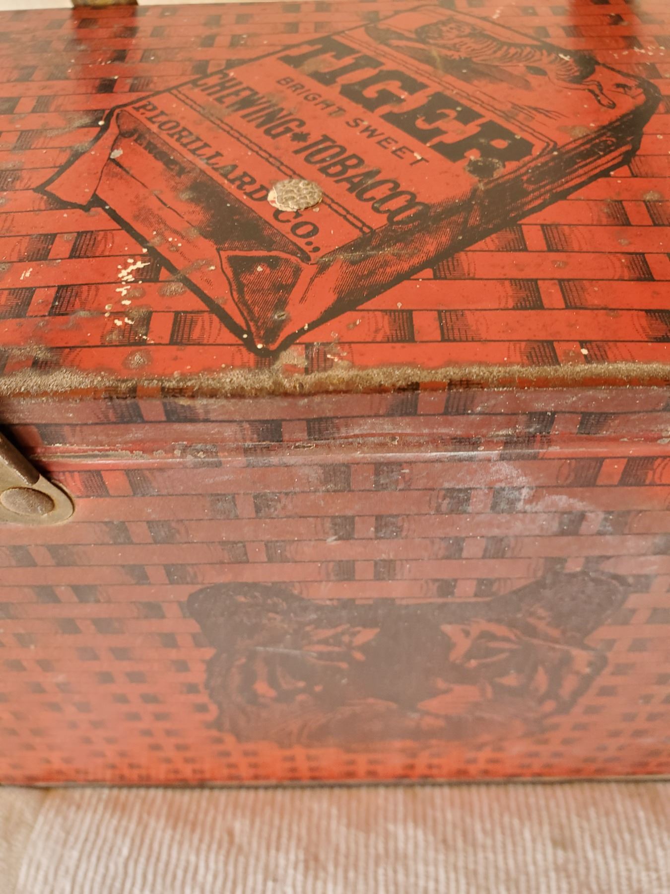 10" BY 8" BY 5.5" TIGER CHEWING TOBACCO 'LUNCH KIT' STYLE TIN VERY GOOD GRAPHICS