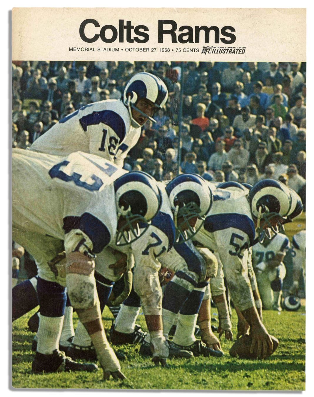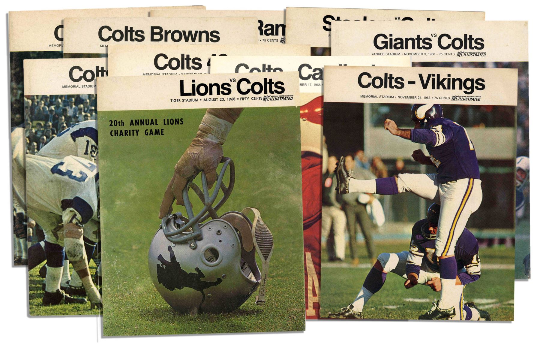 Colorful assortment of ten full programs from Baltimore Colts games played in the 1968 season. Programs from games played at Baltimore Memorial Stadium showcase the Colts versus the Rams, Vikings, Browns, Bears, Cardinals and 49ers. Away games include a program from a Steelers vs. Colts game at Pitt Stadium, a Giants vs. Colts game at Yankee Stadium, and a Lions vs. Colts game at Tiger Stadium. Each 8.5'' x 10.75'' program runs about 75pp. Light overall toning and creasing. All are in very good to near fine condition.