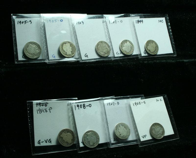 1908-o, 1898-p, 1900-s (VF), 1899-p, 1901-o, 1903-p, 1903-o (toned), 1905-o, 1905-s, 1907-d. Estimated Value $50