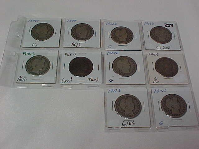 10 Barber Half $: 1896-O AG, 99 AG/G, 02-O G, 06-O G, 06D AG/G, 06S G toned, 07-O G, 10S AG, 12S G/VG, 14S G