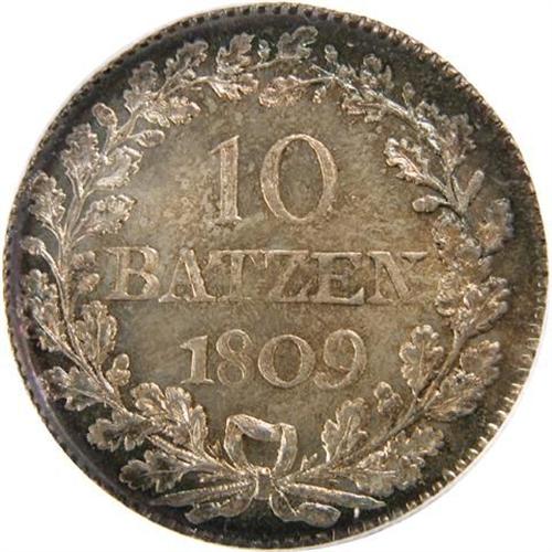 10 Batzen 1809 ICG MS-69. Superbly lustrous and near flawless surfaces are beautifully toned in light golds and ambers with iridescent blues at the rims