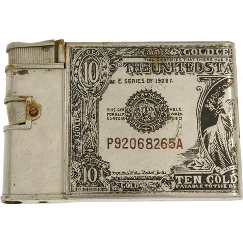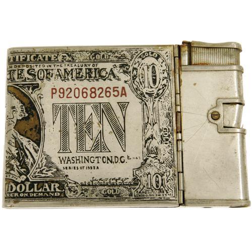<B>$10 Bill Cigarette Case and Lighter.</B></I> This is an unusual all-in-one combination that uses a 1928A $10 Gold as its model. The cigarette case is of the half-size variety. The hinge works while the clasp is broken and the lighter does not work either. A wick is observed, but the fuel plug is missing. It is still a desirable representative of this collecting speciality.<BR><BR><b>Shipping:</b> Coins & Currency (<a target="_blank" href="http://www.heritageauctions.com/common/shipping.php">view shipping information</a>)