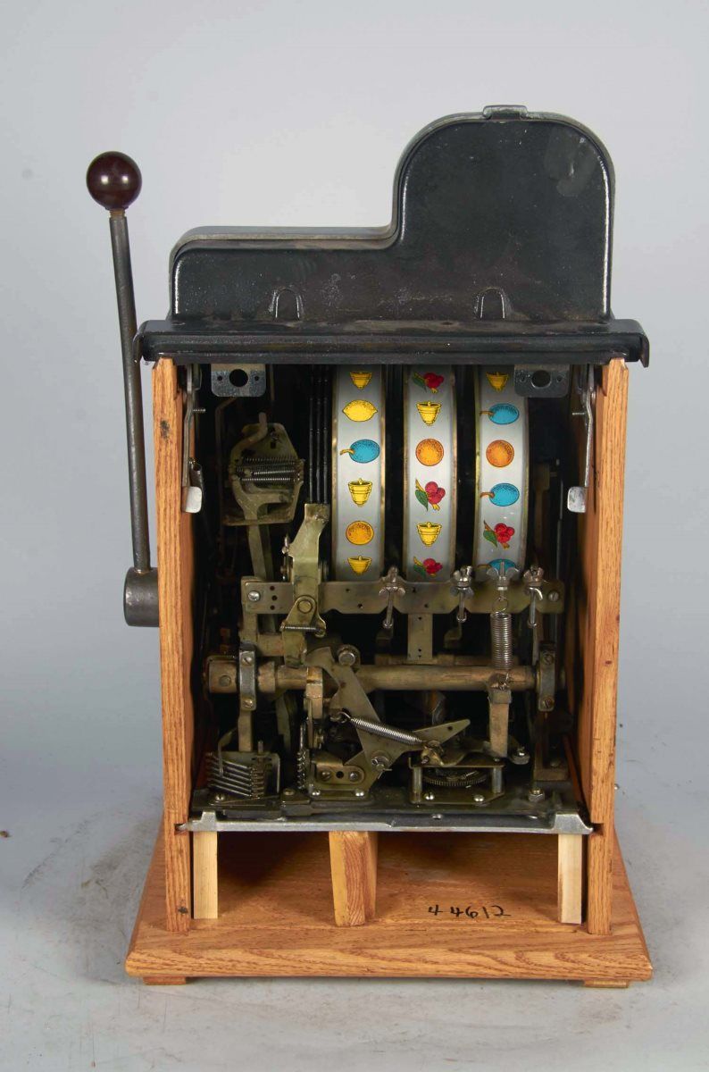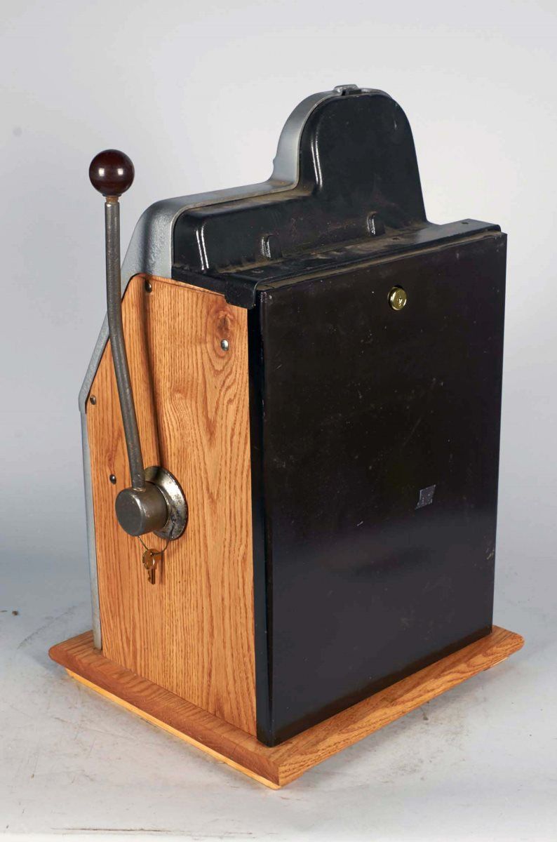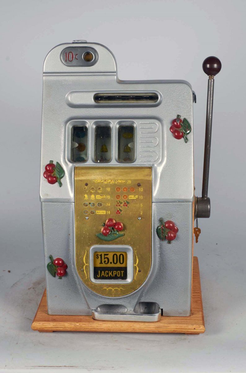 10 ¢ Mills Black Cherry Half Top 3-Reel Escalator Bell Slot Machine c1946, Castings & mechanism are original, On free play Condition Fair - Good Size 16" x 15" x 26" Includes key.