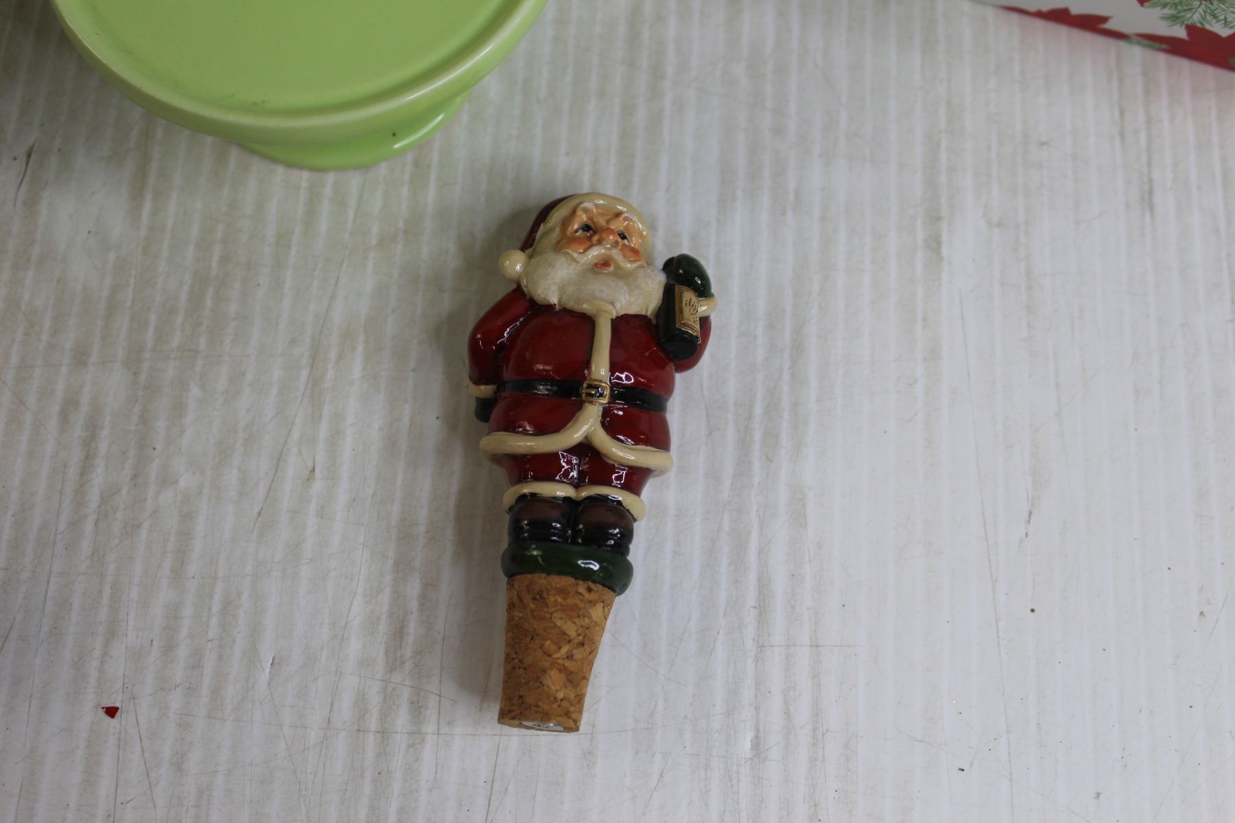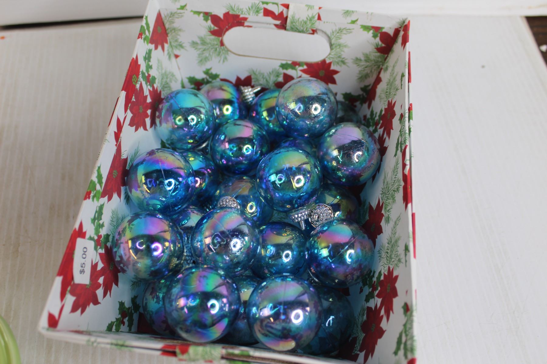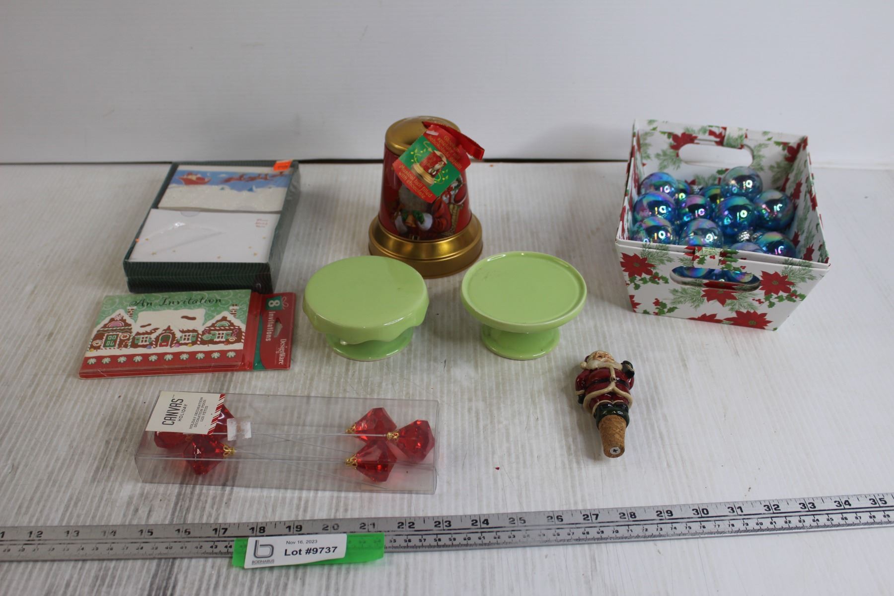(10+) Blue Christmas Ornaments, (2) Poinsette-Patterned Baskets, Pack of Christmas Invitations, Musical Bell - Works, Misc.
