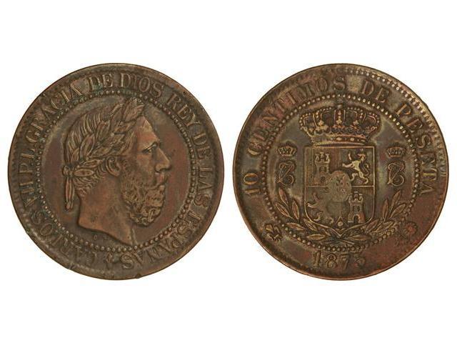 10 Céntimos. 1875. BRUSELAS. Anverso y reverso coincidente, tipo medalla. Reverso girado 10% aprox. MBC+/MBC.