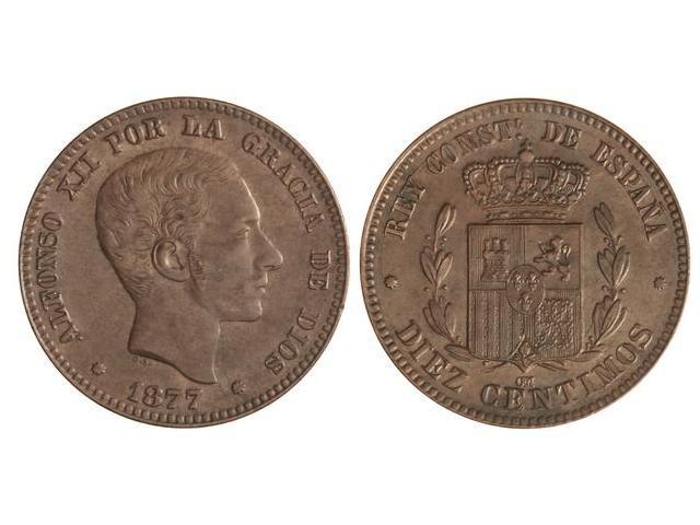 10 Céntimos. 1877. BARCELONA. O.M. Pátina marrón. EBC+.