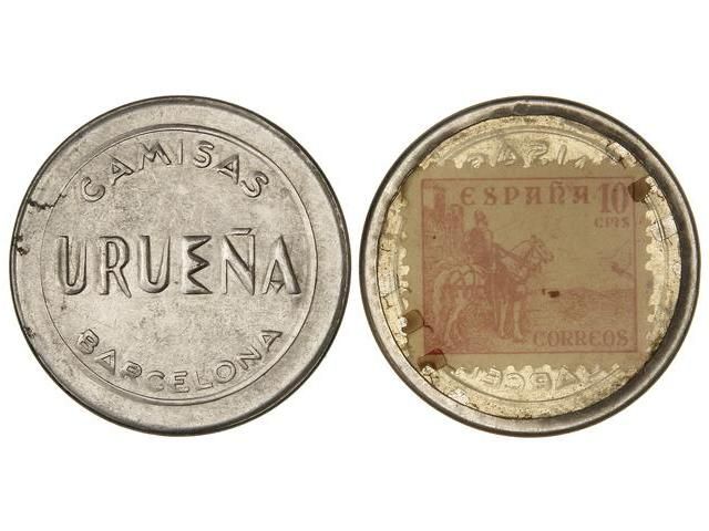10 Céntimos. Emisión de Postguerra. CAMISA URUEÑA. BARCELONA. Disco de aluminio con sello de Correos de 10 Cts. del Cid al dorso. ESCASO. L-1392. EBC.