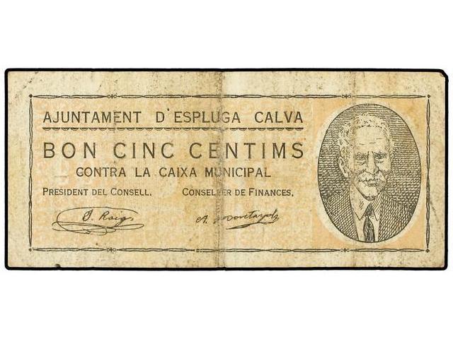 10 Cèntims. 10 Octubre 1937. Aj. d´ESPLUGA CALVA. (Sucio). MUY ESCASO. AT-953; T-1090. MBC.