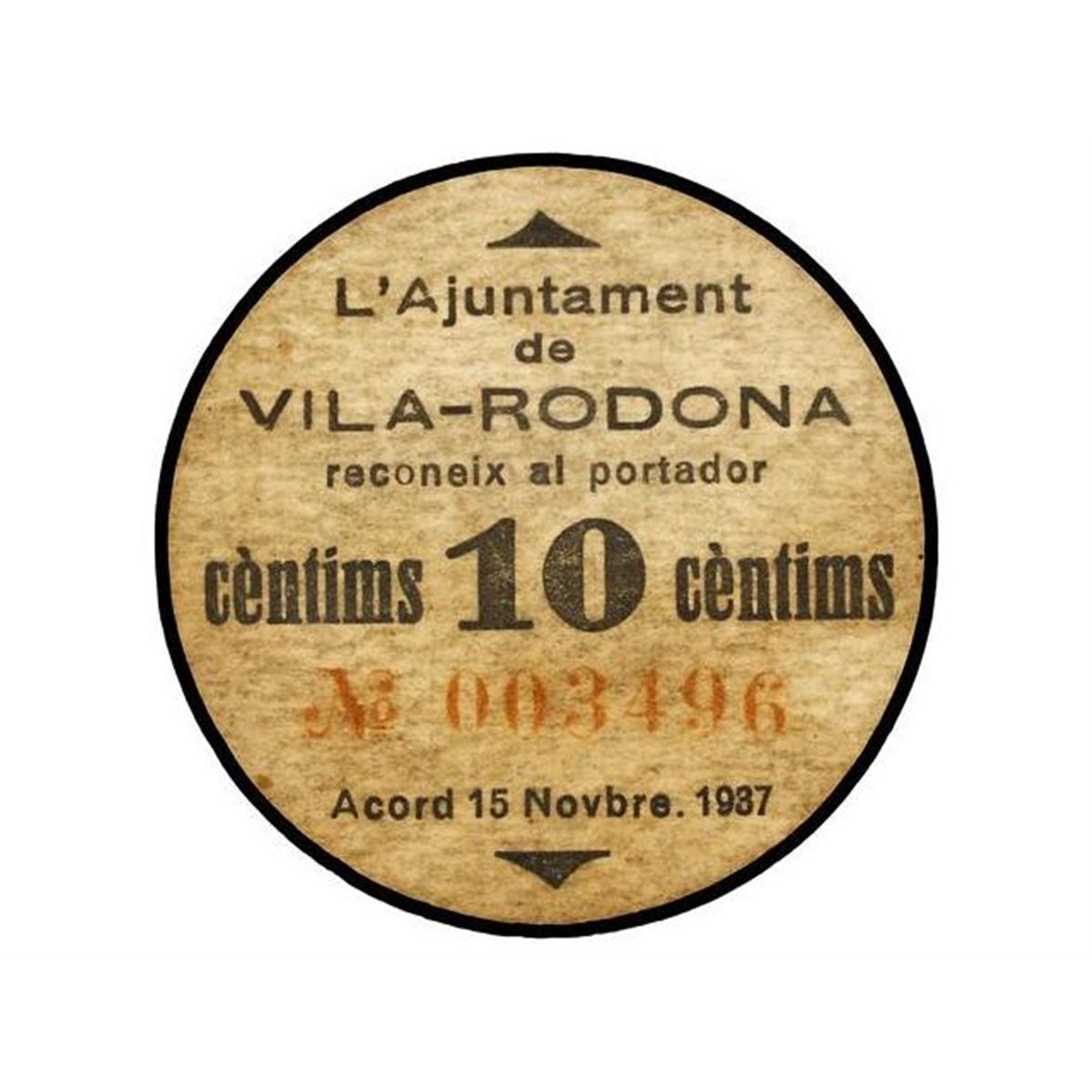 10 Cèntims. - - 15 Novembre 1937. - - Aj. de VILA-RODONA. - - Cartón disco. (Sucio). ESCASO. AT-2875; T-3321. MBC+. - -