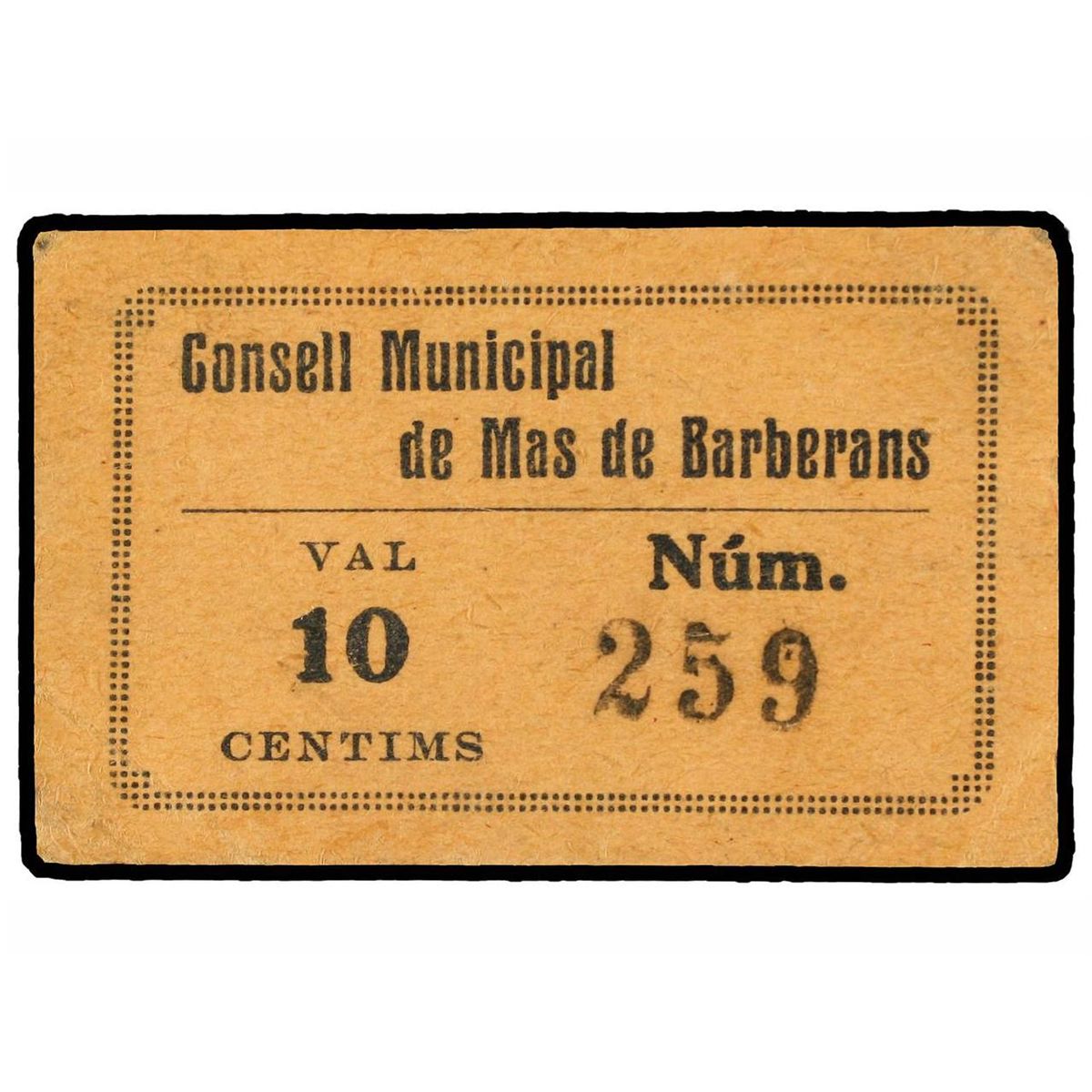 10 Cèntims. - C.M. de MAS DE BARBERANS. - Cartón. RARÍSIMO. AT-1457; T-1663. MBC+. - -