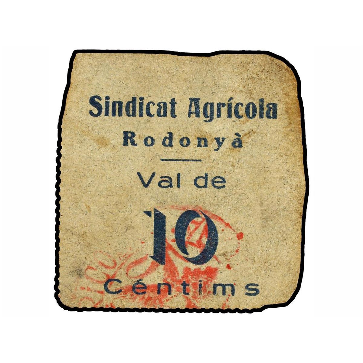 10 Cèntims. - RODONYÀ. SINDICAT AGRÍCOLA. - Cartón. (Ligeramente recortado). RARÍSIMO. T-2535. MBC. - -