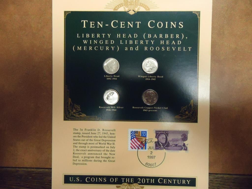 BARBER DIME, MERCURY DIME, SILVER ROOSEVELT DIME, CLAD ROOSEVELT DIME AND STAMPS (AS SHOWN)