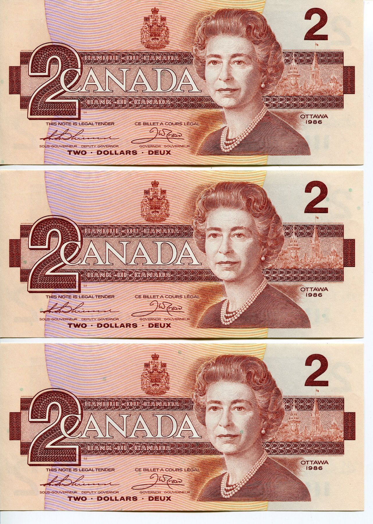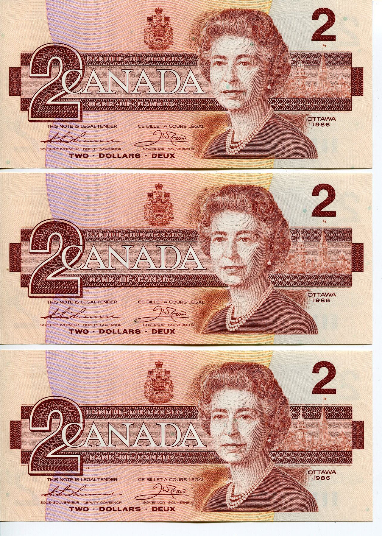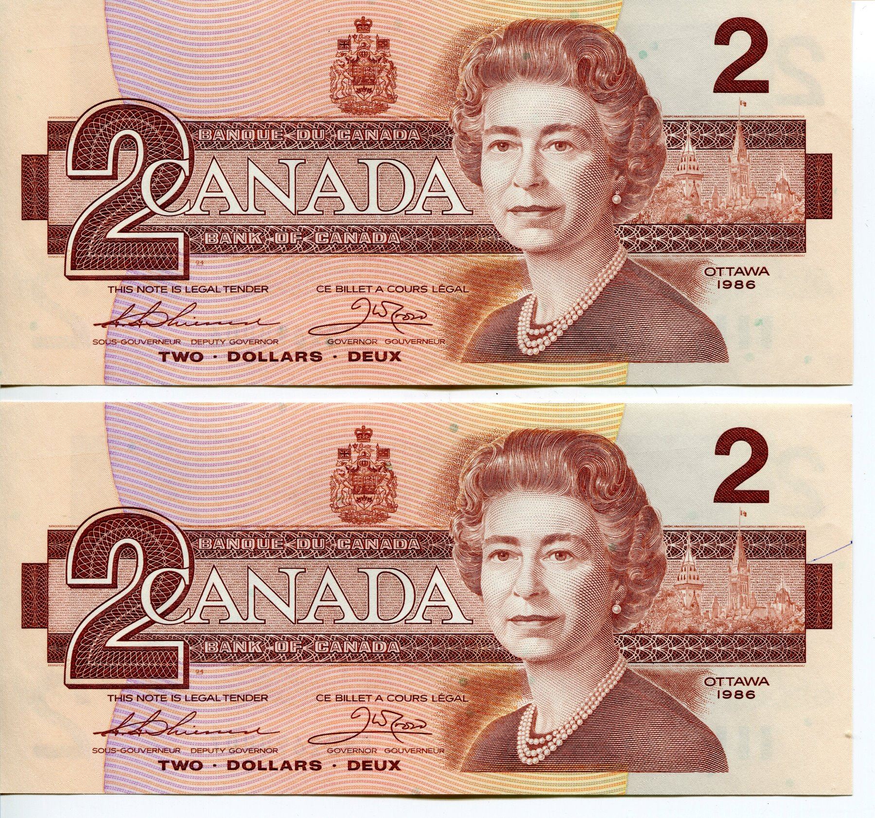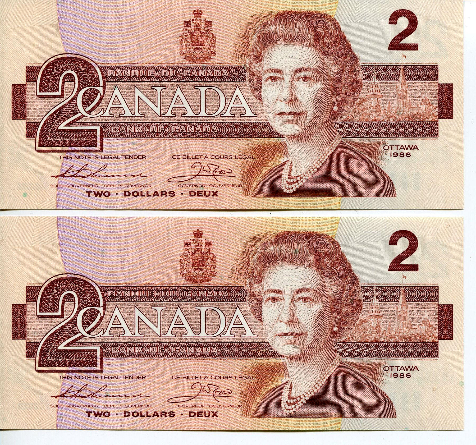 10 CNDN $2 BANK NOTES 1986 CONSECUTIVE THREE LETTER SERIAL NUMBERS THIESSIN/CROWER, UNCIRCULATED